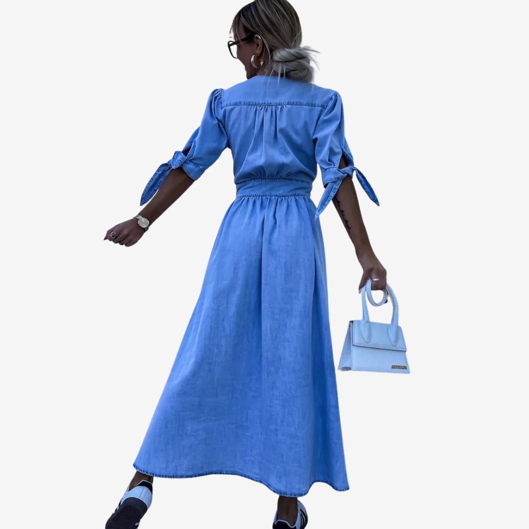 Découvrez la robe Amelina™, un denim léger de rêve qui redéfinit le chic décontracté. Cette robe longue boutonnée présente un décolleté en V profond, des manches bouffantes souples nouées aux poignets et une taille haute flatteuse qui épouse une silhouette décontractée jusqu'aux chevilles. L'ourlet brut lui confère une allure tendance, tandis que le denim doux lui confère une légèreté et une élégance naturelle. Que vous l'associiez à des baskets ou des sandales, Amelina™ s'adapte à votre quotidien avec aisance et charme.