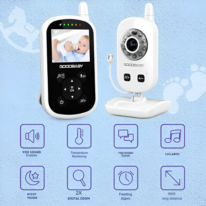 Protégez votre bébé grâce à notre babyphone perfectionné. Il est doté d'une connexion stable de 2,4 GHz, d'un écran haute résolution de 2,4 pouces, d'un système audio bidirectionnel, d'une vision nocturne infrarouge et d'un système de surveillance de la température de la pièce. Installation facile avec une visibilité à 360° et une portée allant jusqu'à 300 mètres. Le mode Eco optimise la durée de vie des piles et les alertes d'alimentation vous tiennent informé.