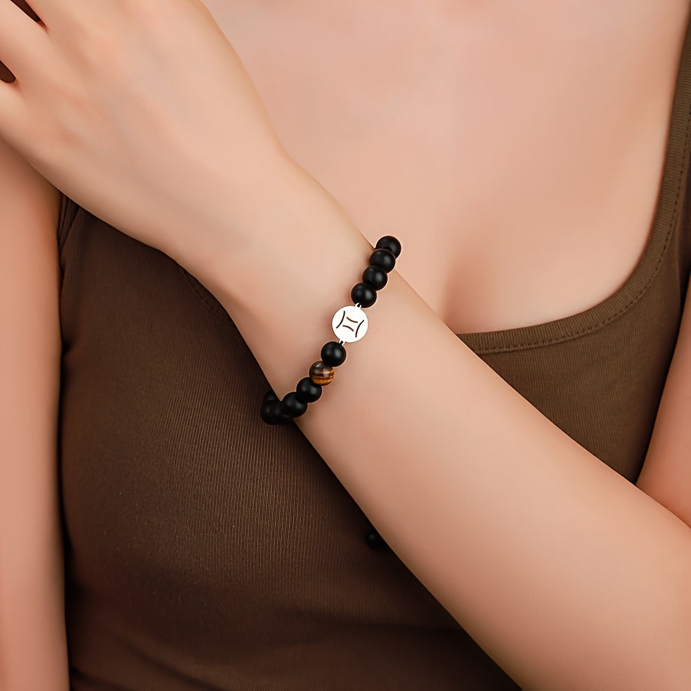Exprimez votre personnalité avec ce bracelet zodiaque en perles naturelles. Conçu avec des perles noires mates et une perle œil de tigre unique, il est orné d’un médaillon gravé de votre signe astrologique.