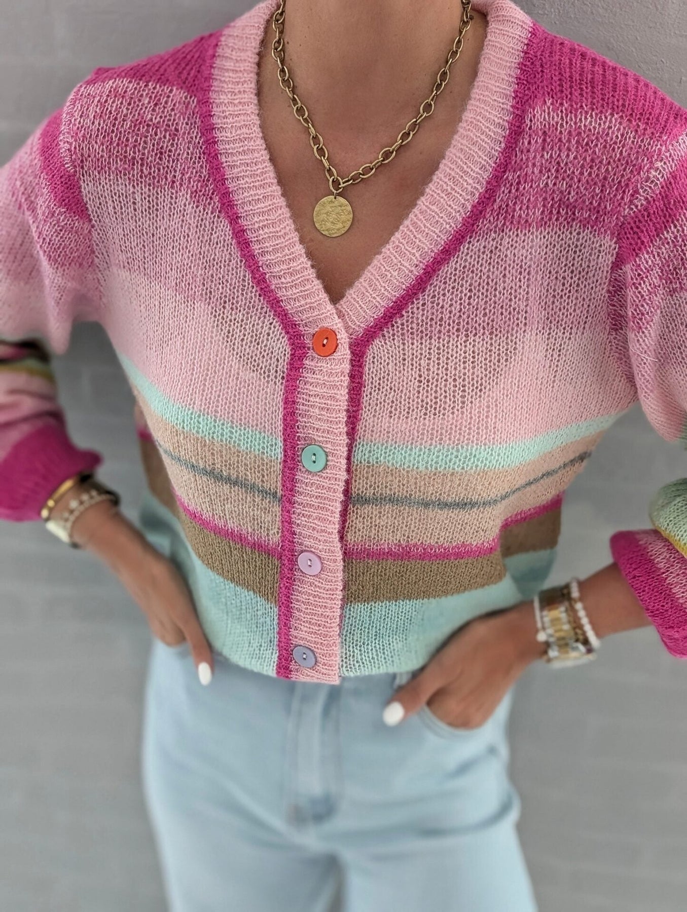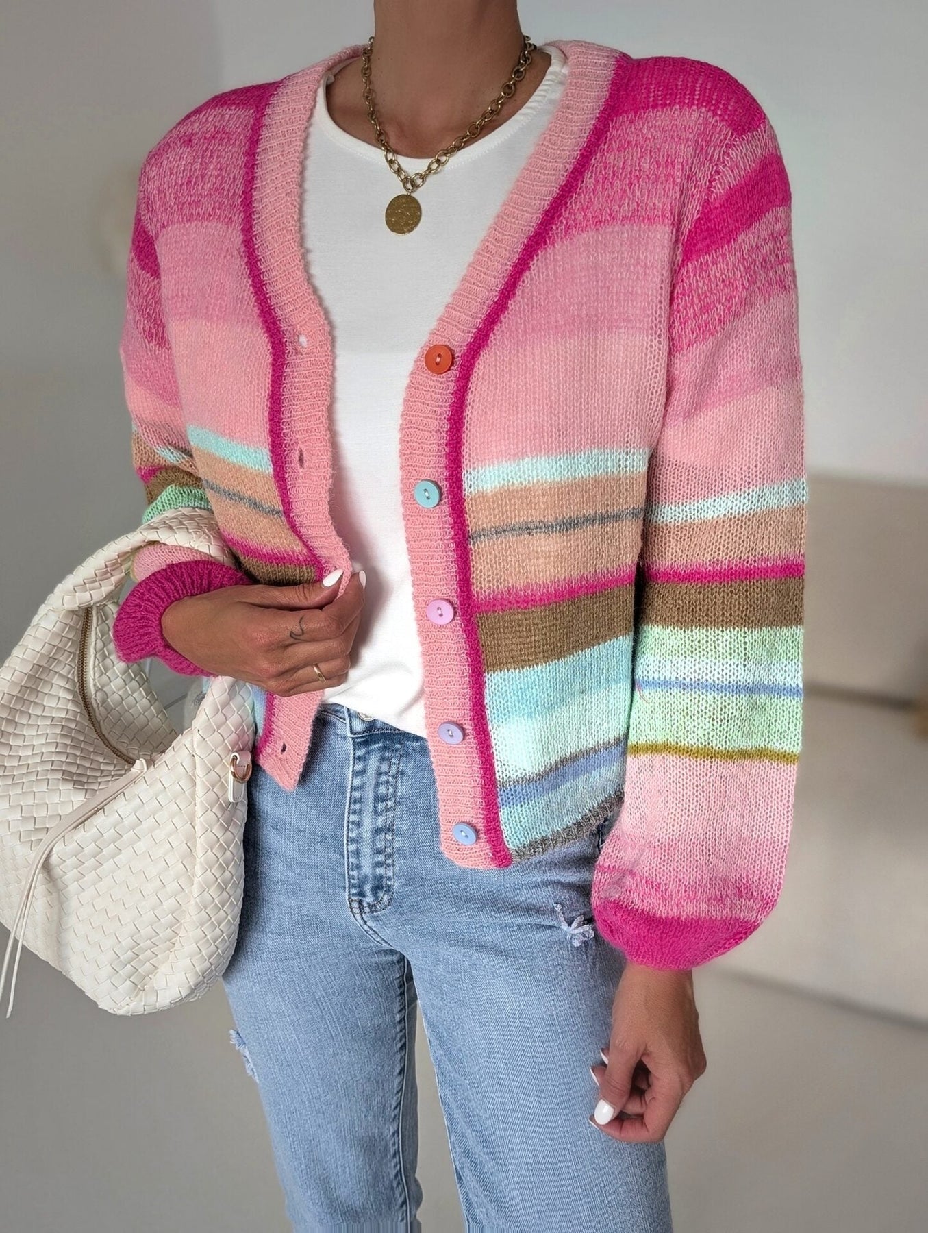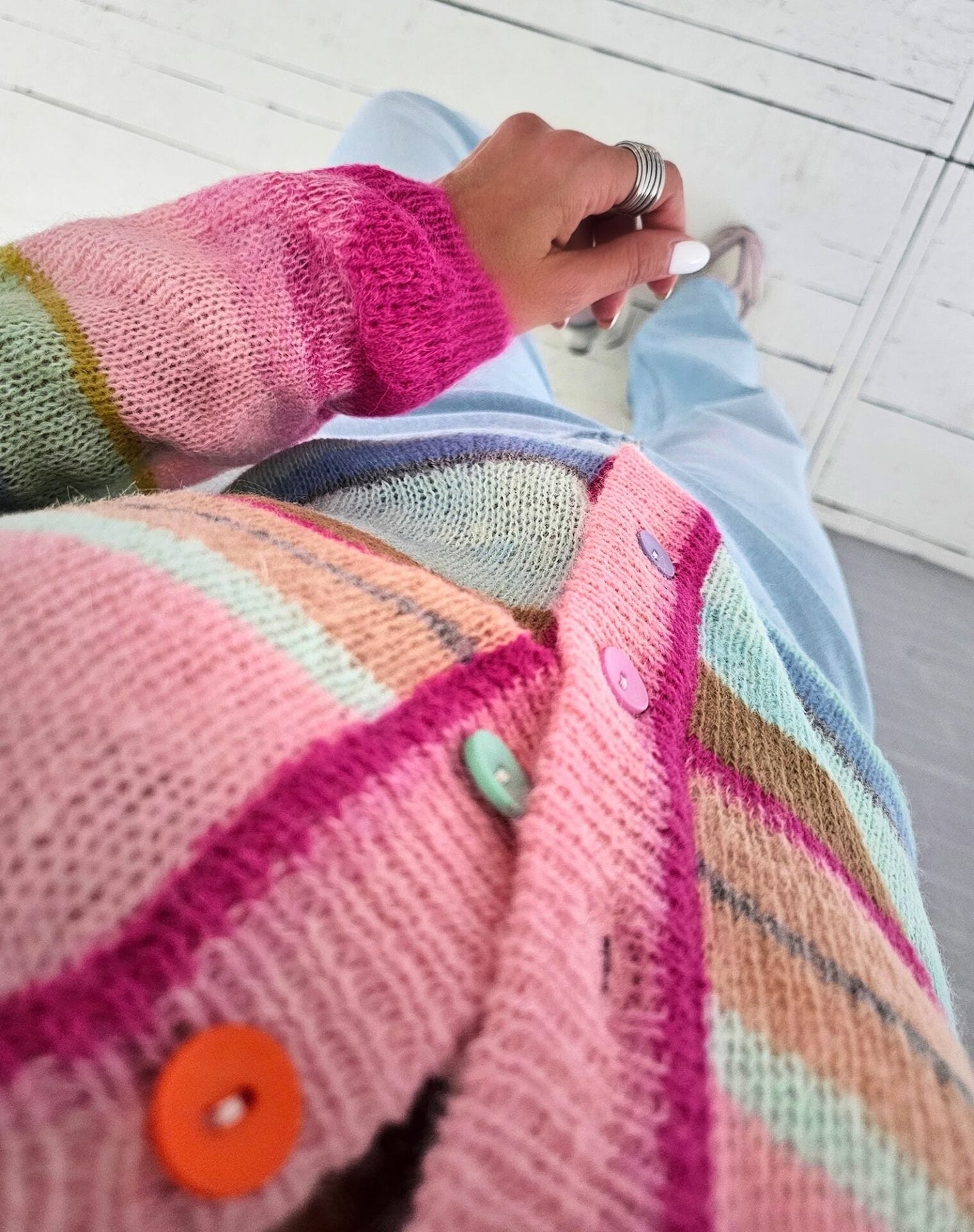Le Cardigan Bonheur enveloppe de douceur et de couleur pour une touche de gaieté au quotidien. Confectionné dans un mélange de viscose et de polyamide, il offre une sensation ultra-douce et un confort absolu. Son design arc-en-ciel illumine chaque tenue, ajoutant une note chaleureuse et vibrante.