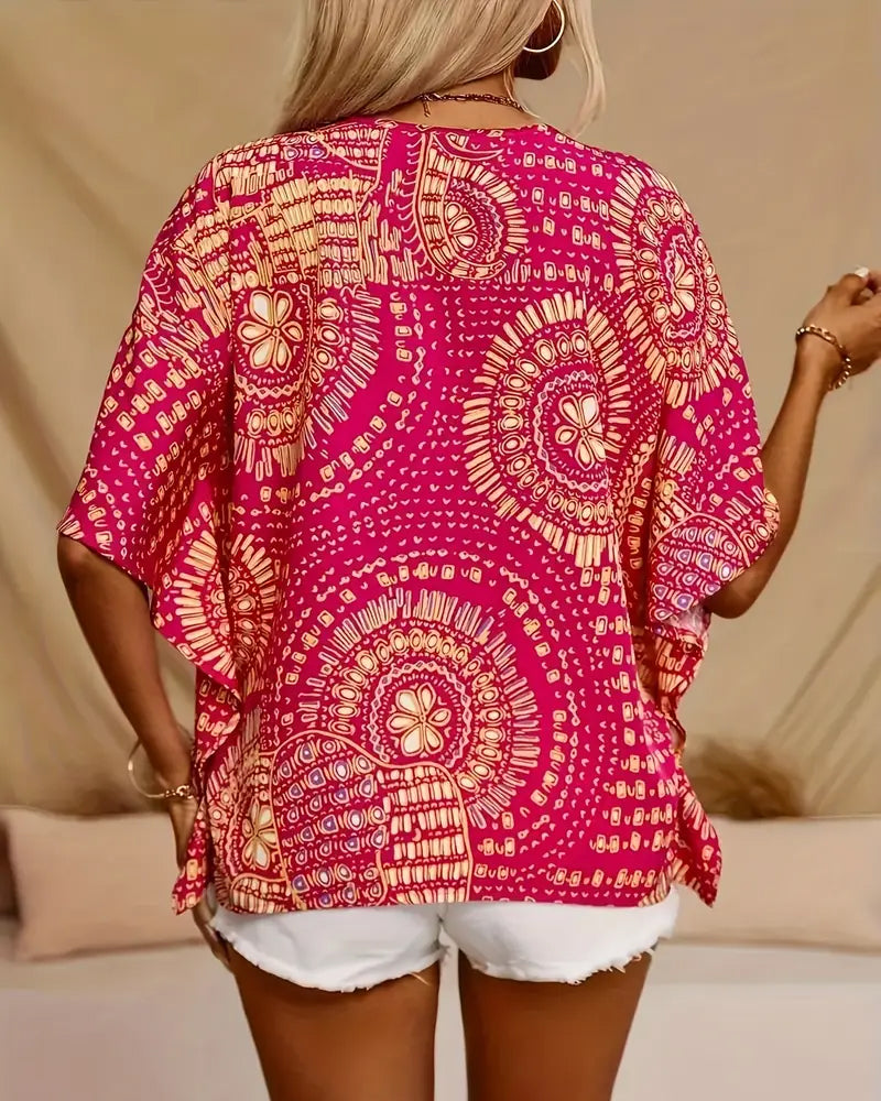 Chemisier décontracté ample col en V imprimé manches chauve-souris