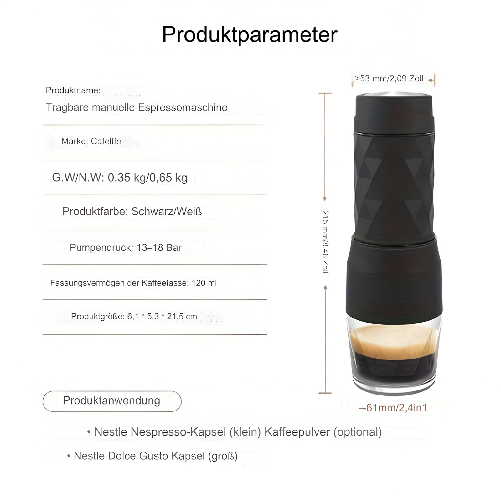 - Compact et portable : Coffee2Go est conçu pour être léger et compact et se glisse facilement dans un sac ou un porte-gobelet, ce qui en fait le compagnon idéal en voyage, au travail ou à l'extérieur.