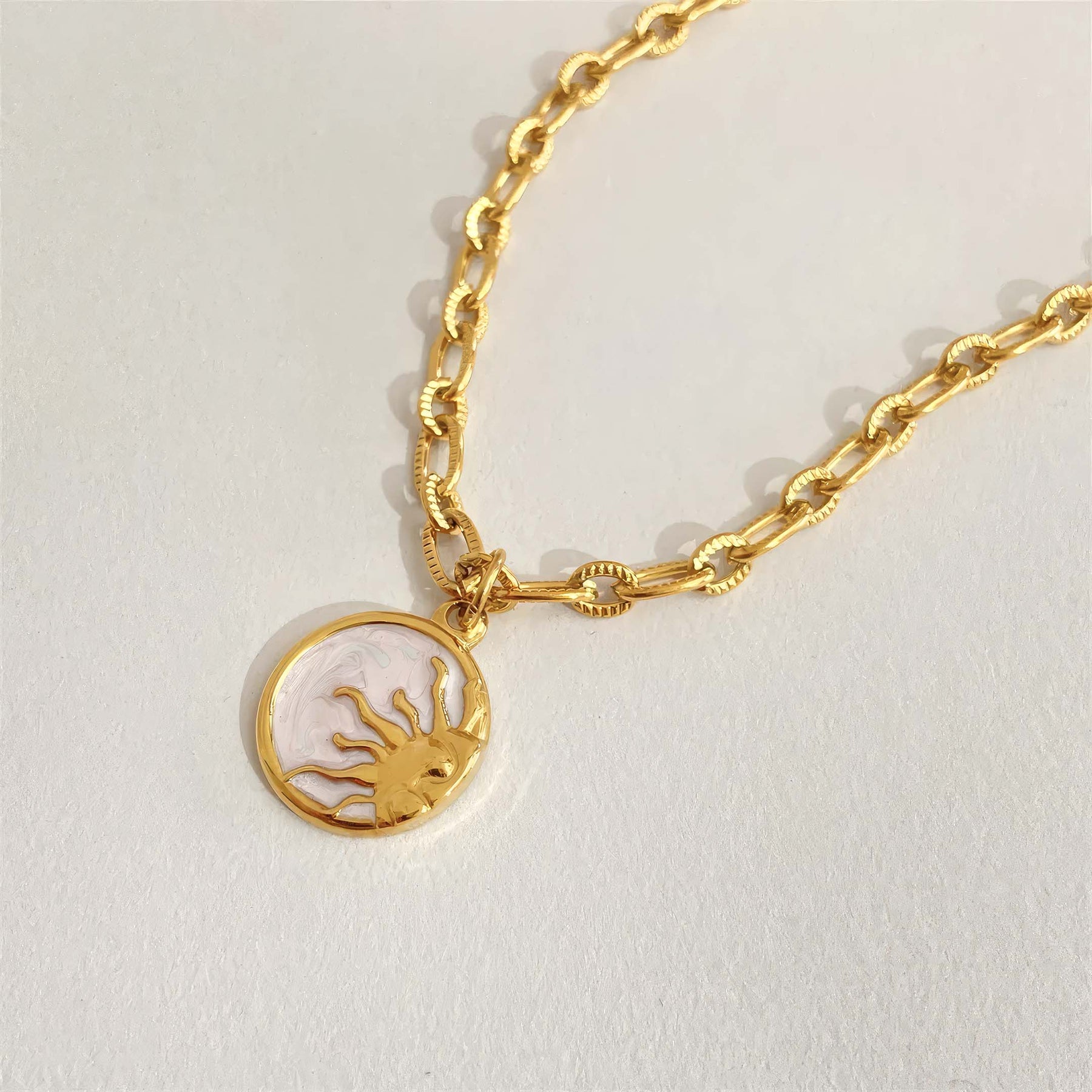 Découvrez la puissance symbolique du Soleil et de la Lune réunis dans un collier raffiné, orné d’une base en nacre lumineuse (45 cm + 5 cm, ajustable).