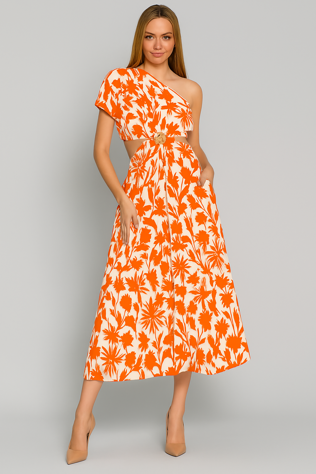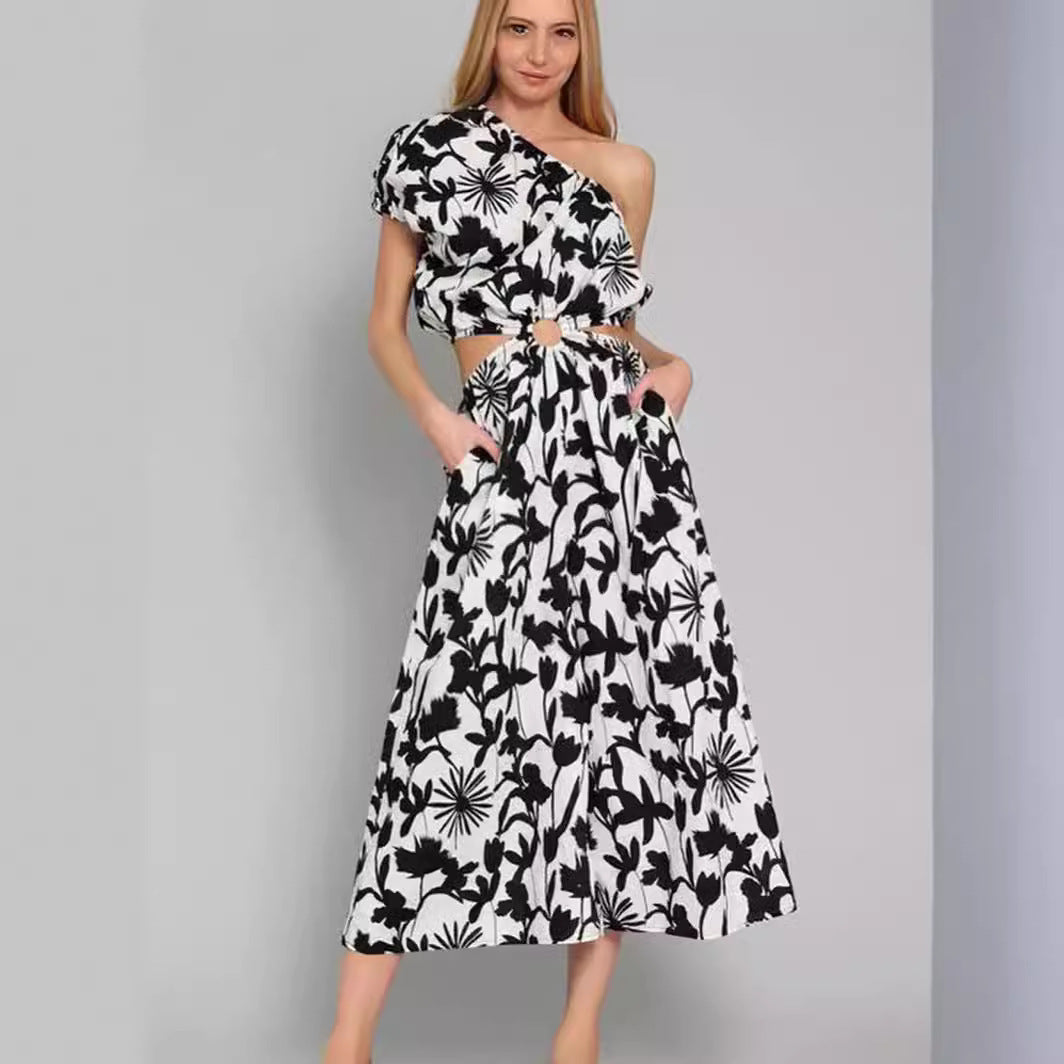 - Design: Asymétrique avec une épaule dénudée et une découpe à la taille ornée d'un anneau.