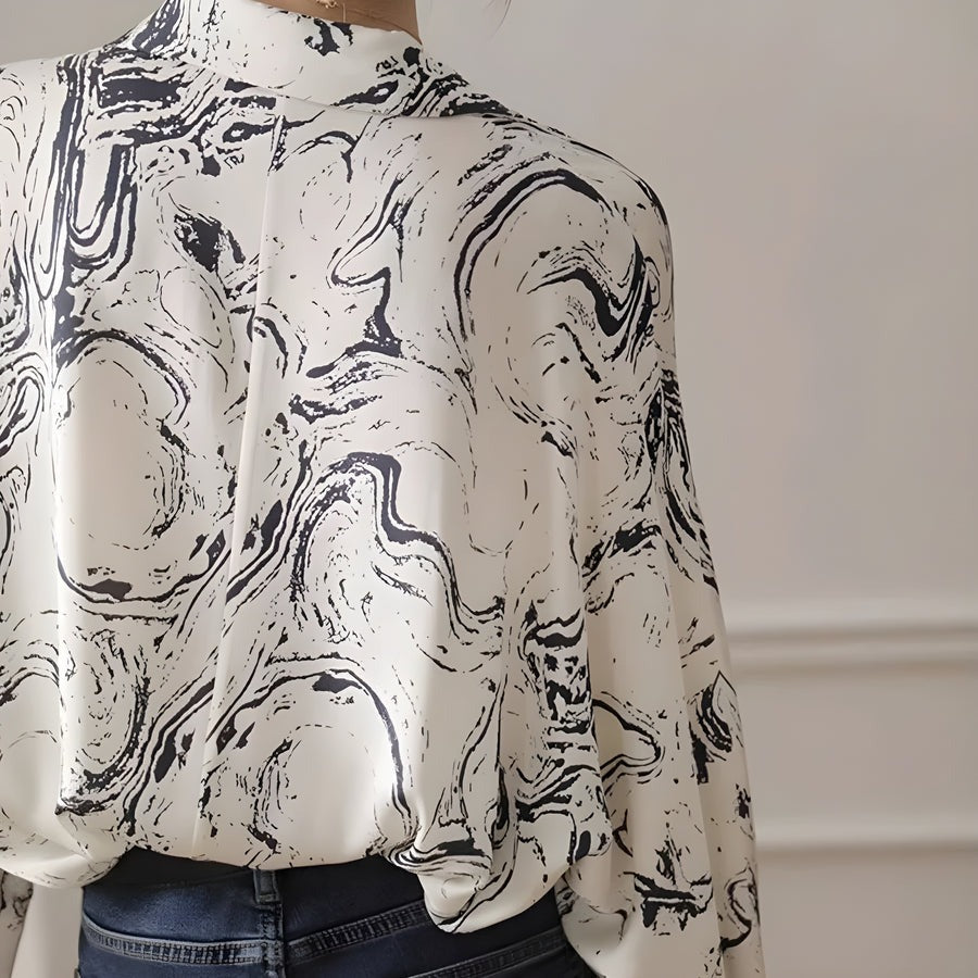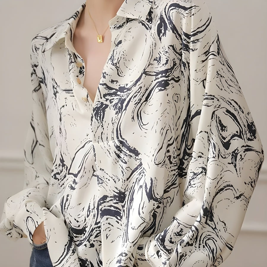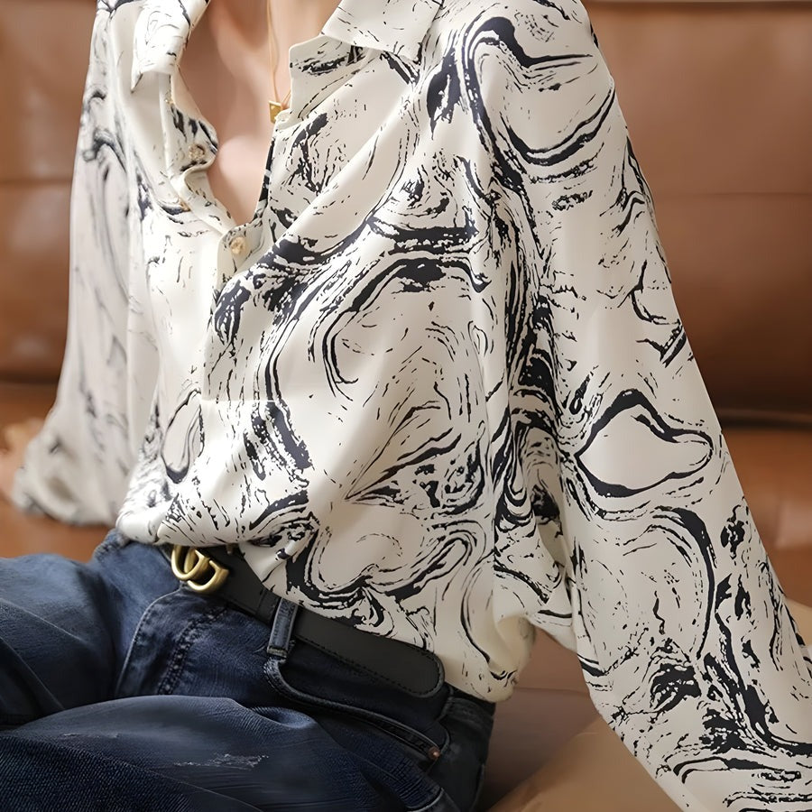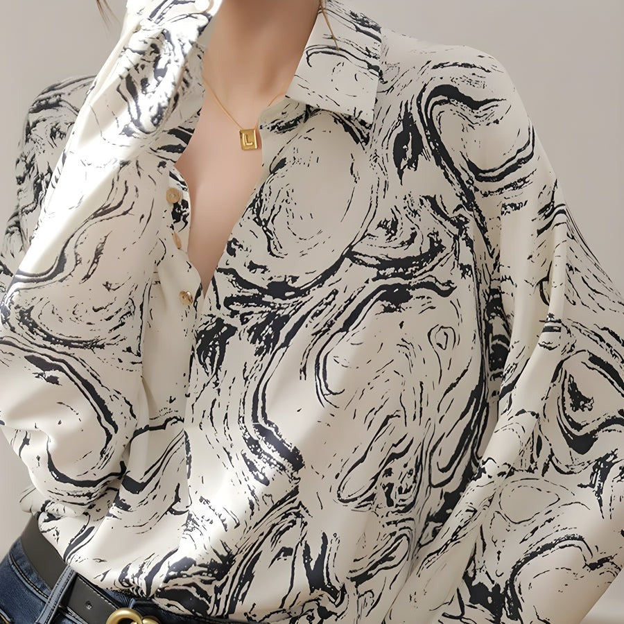 Ein Spritzer Tinte wirbelt in ein einzigartiges monochromes Marmormuster auf diesem seidigen, drapierten Retro-Design. Fließend, leicht und locker sitzend für luftigen Komfort, mit einem hellen Kragen mit Goldknöpfen, der einen Vintage-Touch verleiht.
