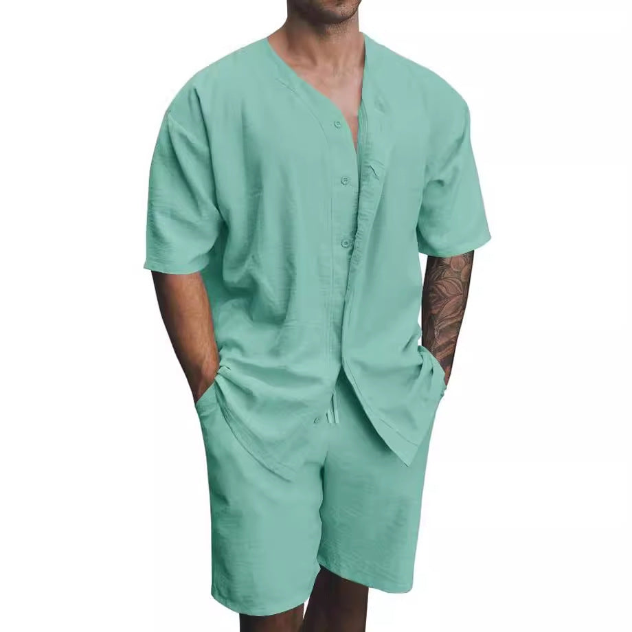 Ensemble deux pièces homme – Coton respirant – Chemise col V boutonnée – Coupe décontractée