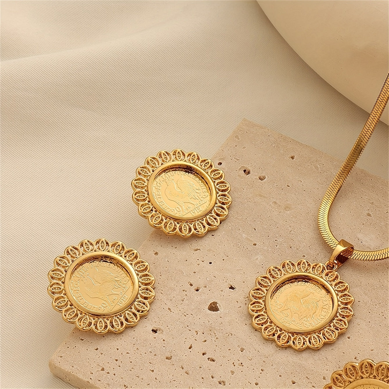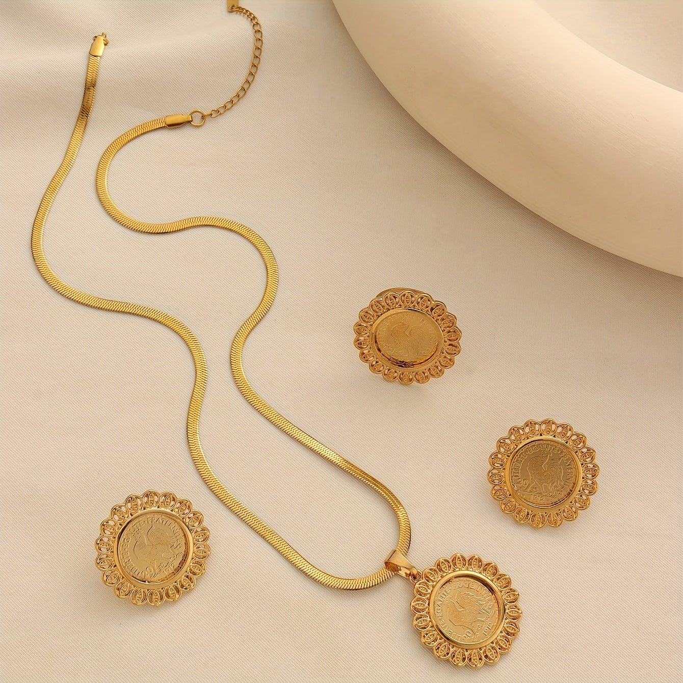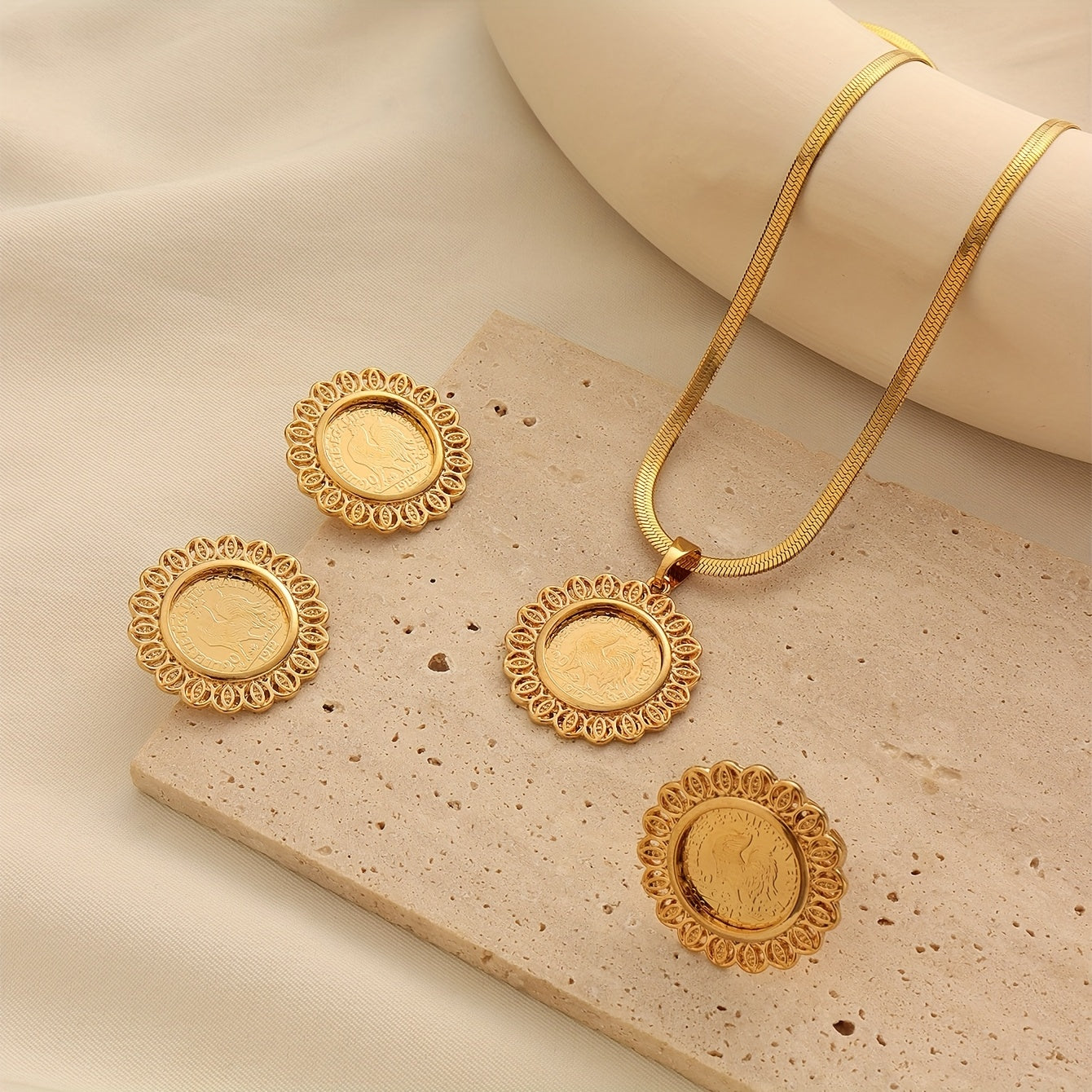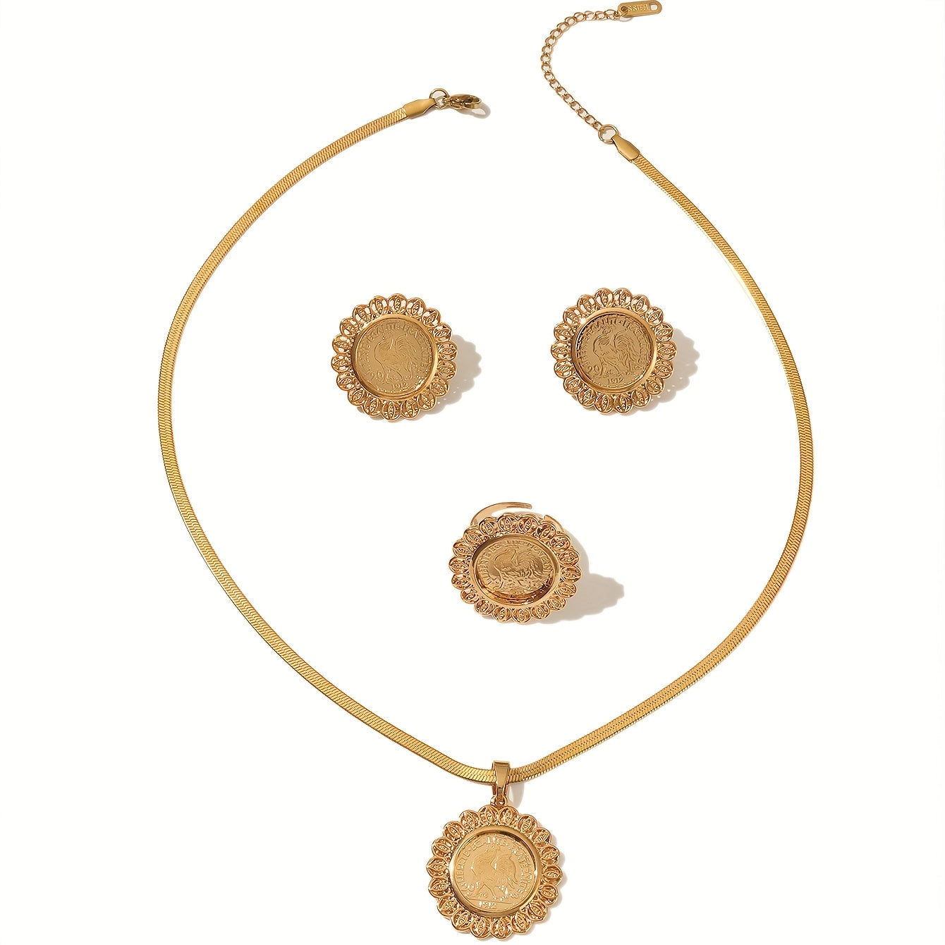 Ensemble élégant 3 pièces – Collier, bague et boucles d’oreilles motif médaille