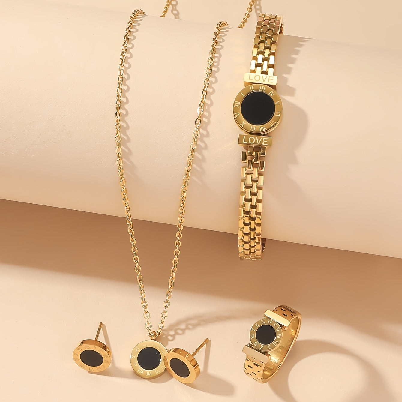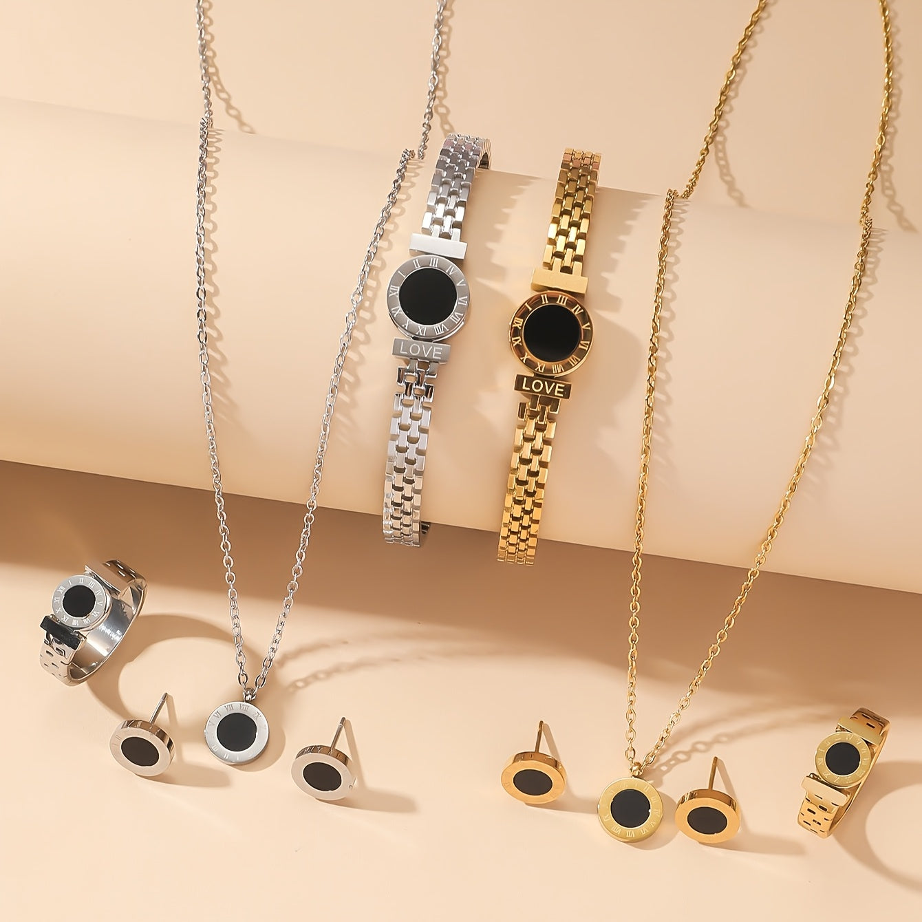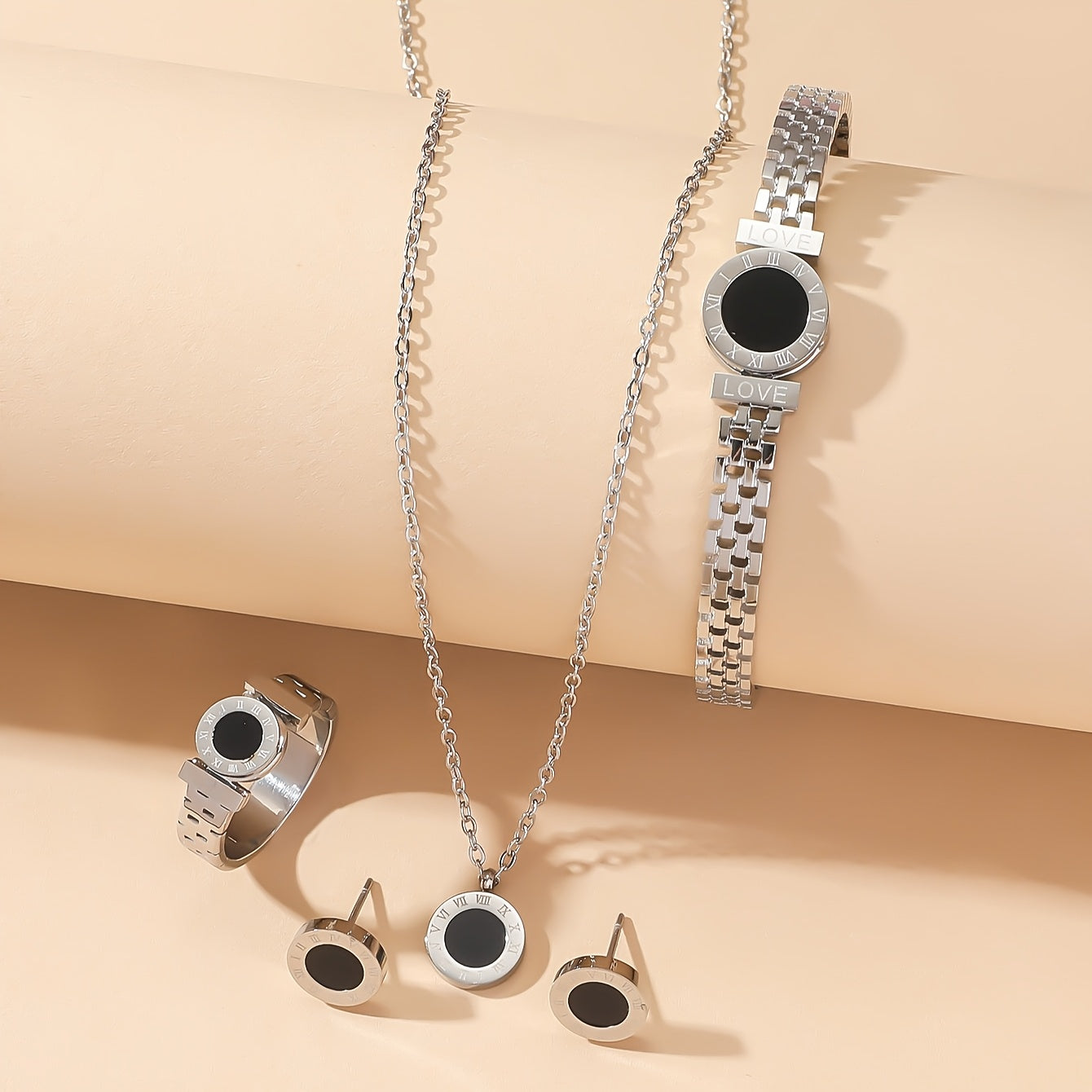 Ensemble élégant 4 pièces – Collier, bracelet, bague et boucles d’oreilles avec médaillon noir