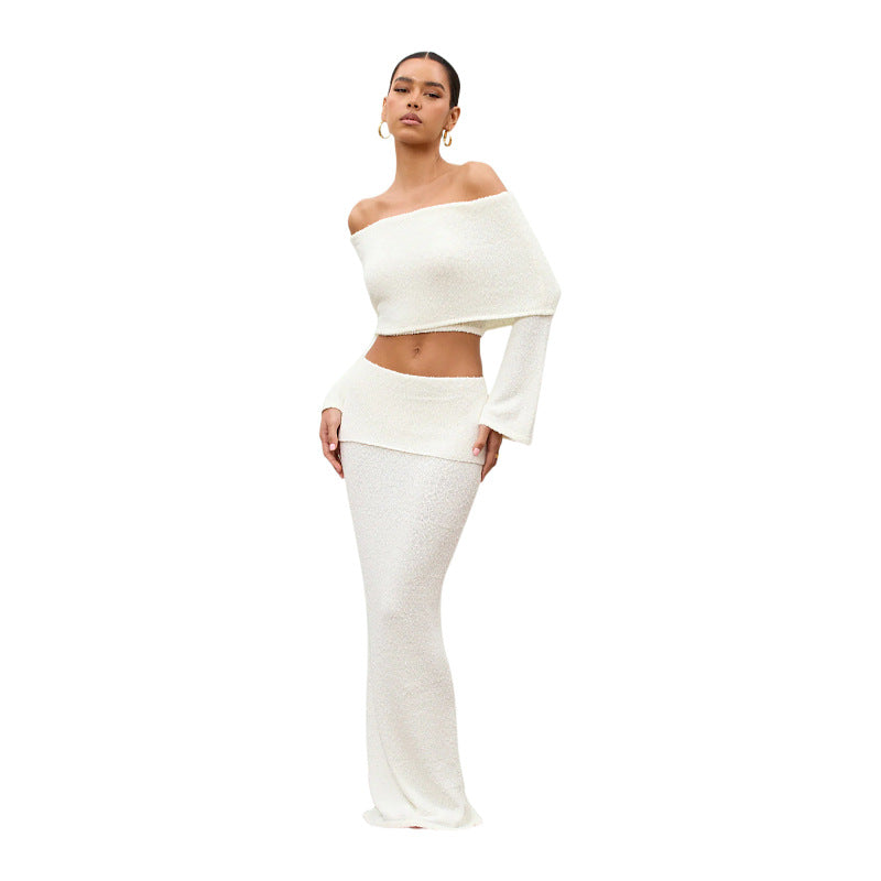 Ensemble Femme Deux Pièces – Haut Épaules Dénudées Manches Longues – Jupe Taille Haute Ajustée