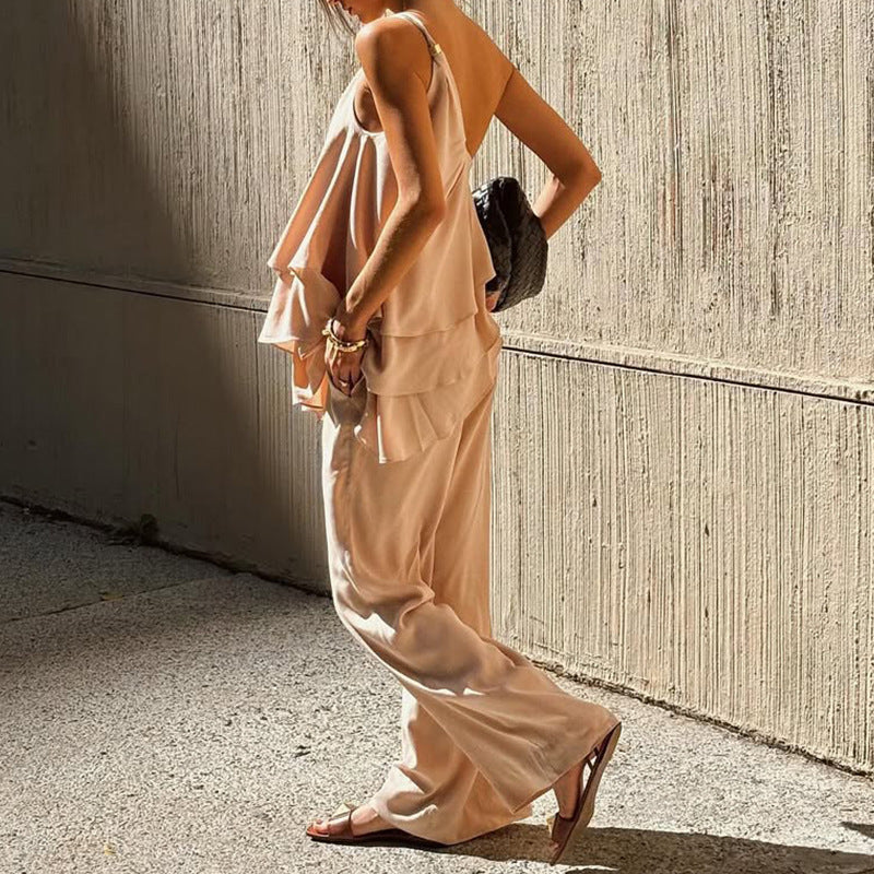 Ensemble femme deux pièces – Top asymétrique à volants – Pantalon fluide long