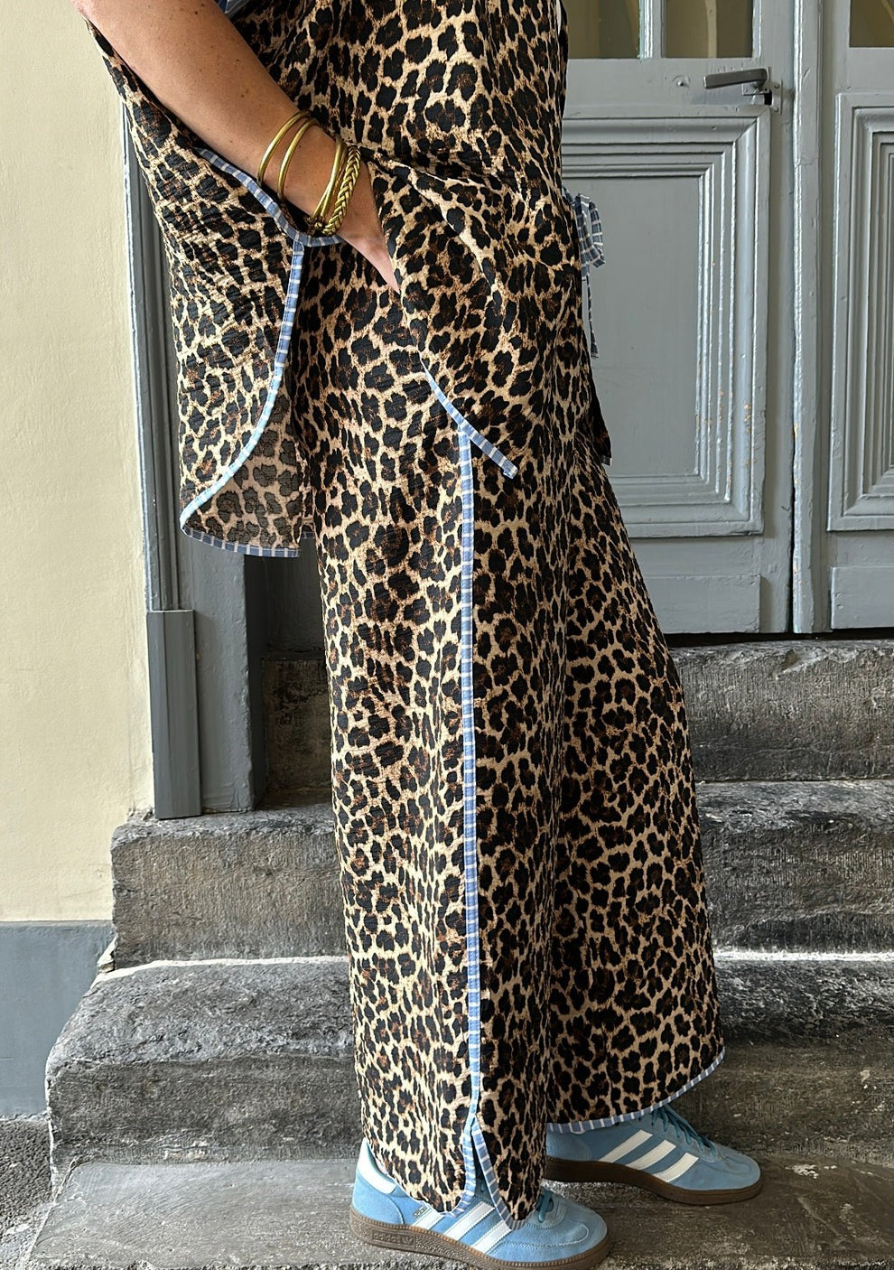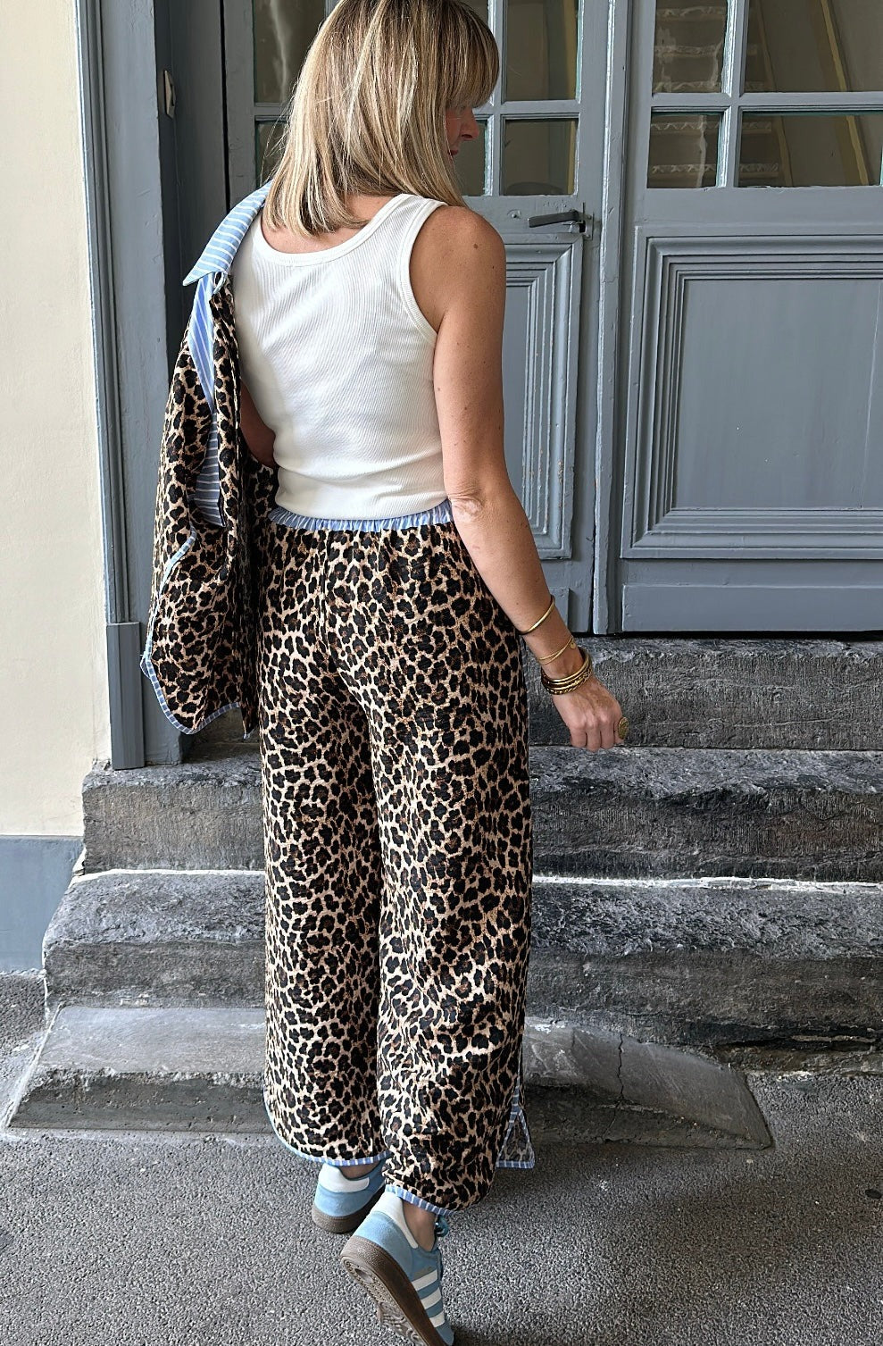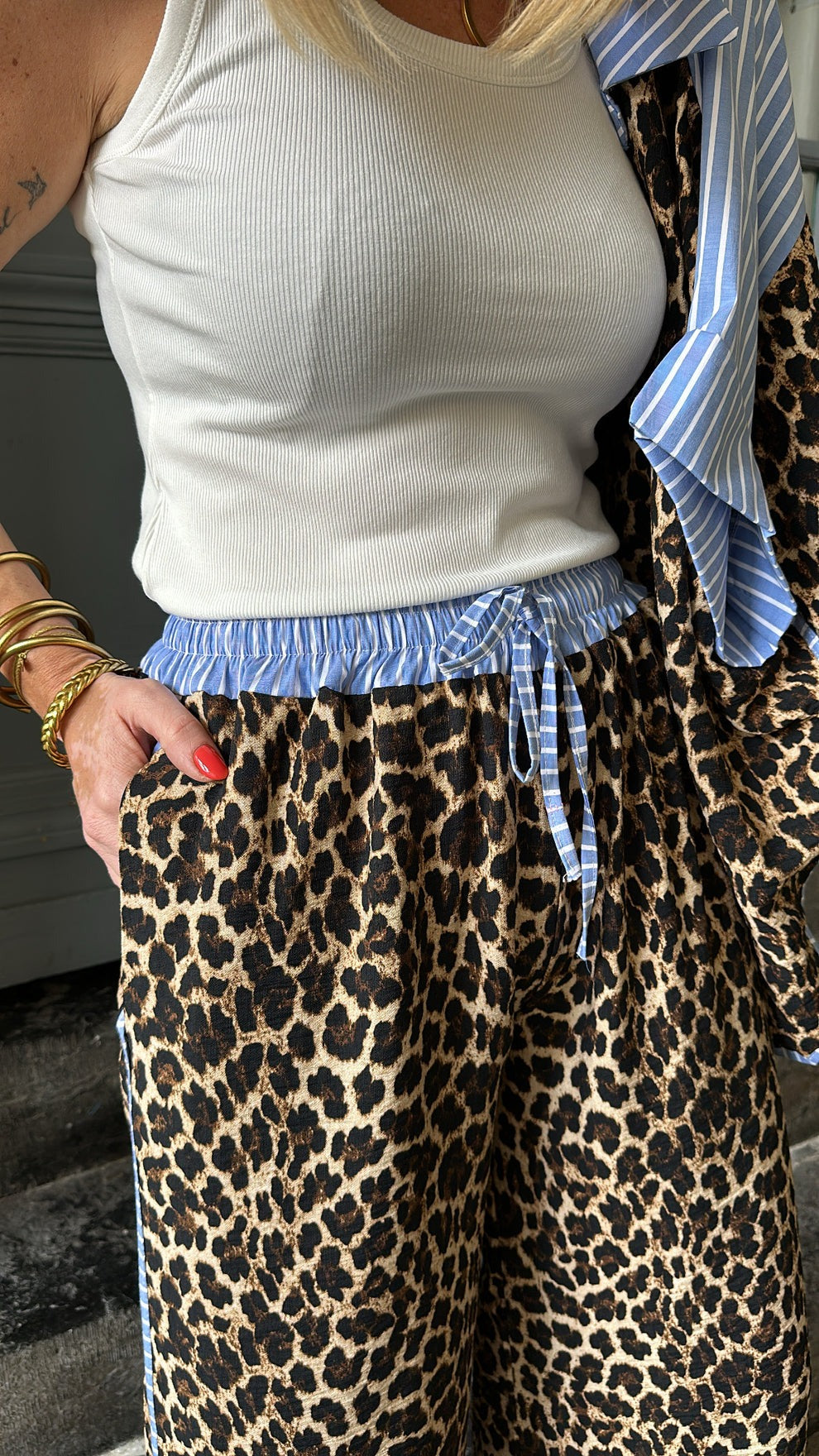Ensemble fluide léopard avec détail rayé bleu au niveau de taille et sur les côtés. La taille est élastiquée.