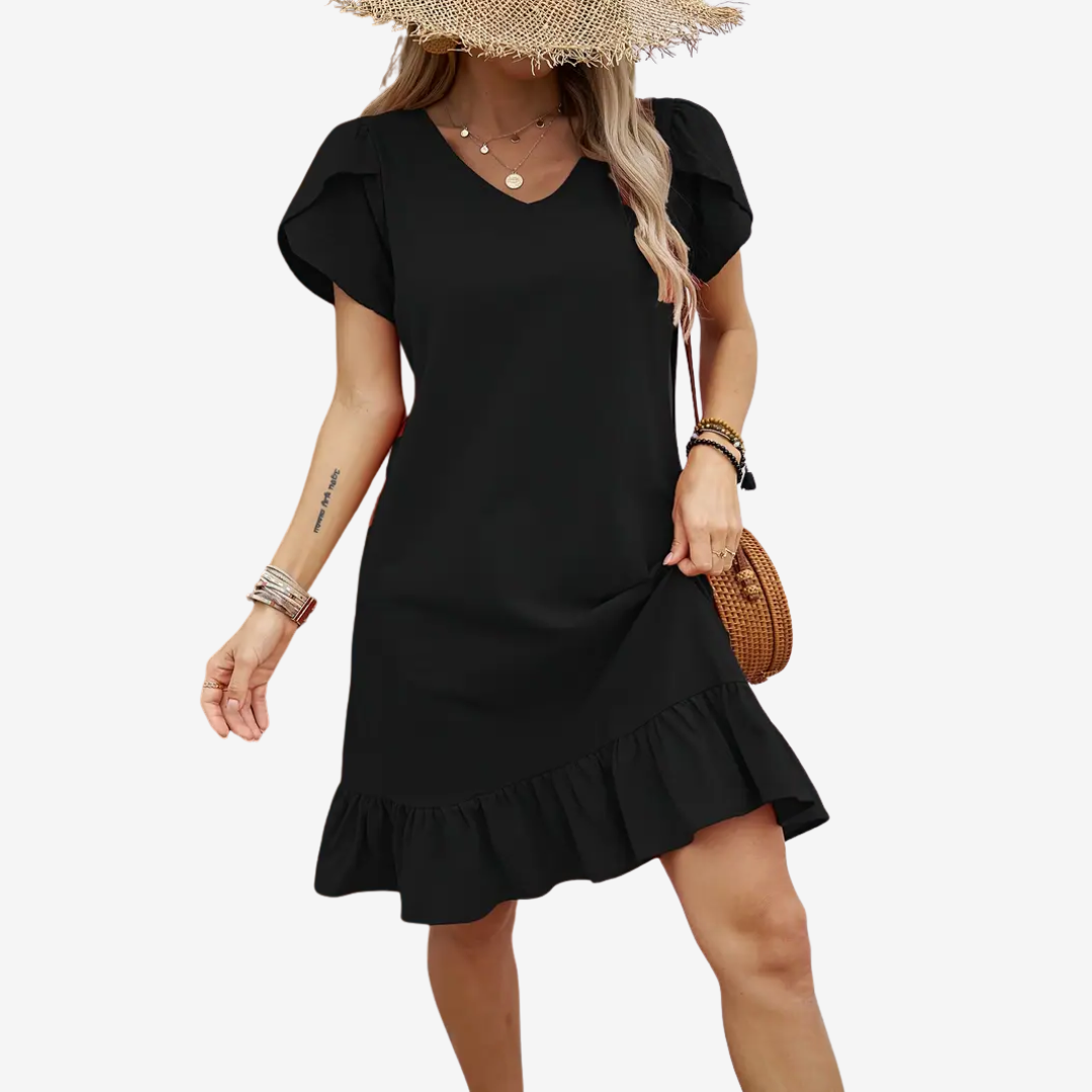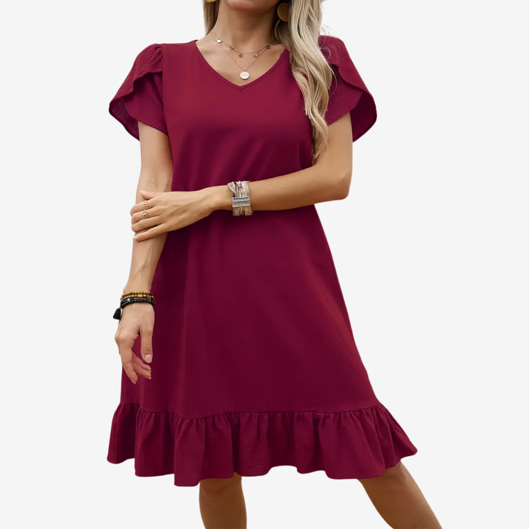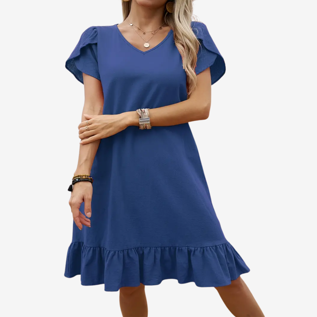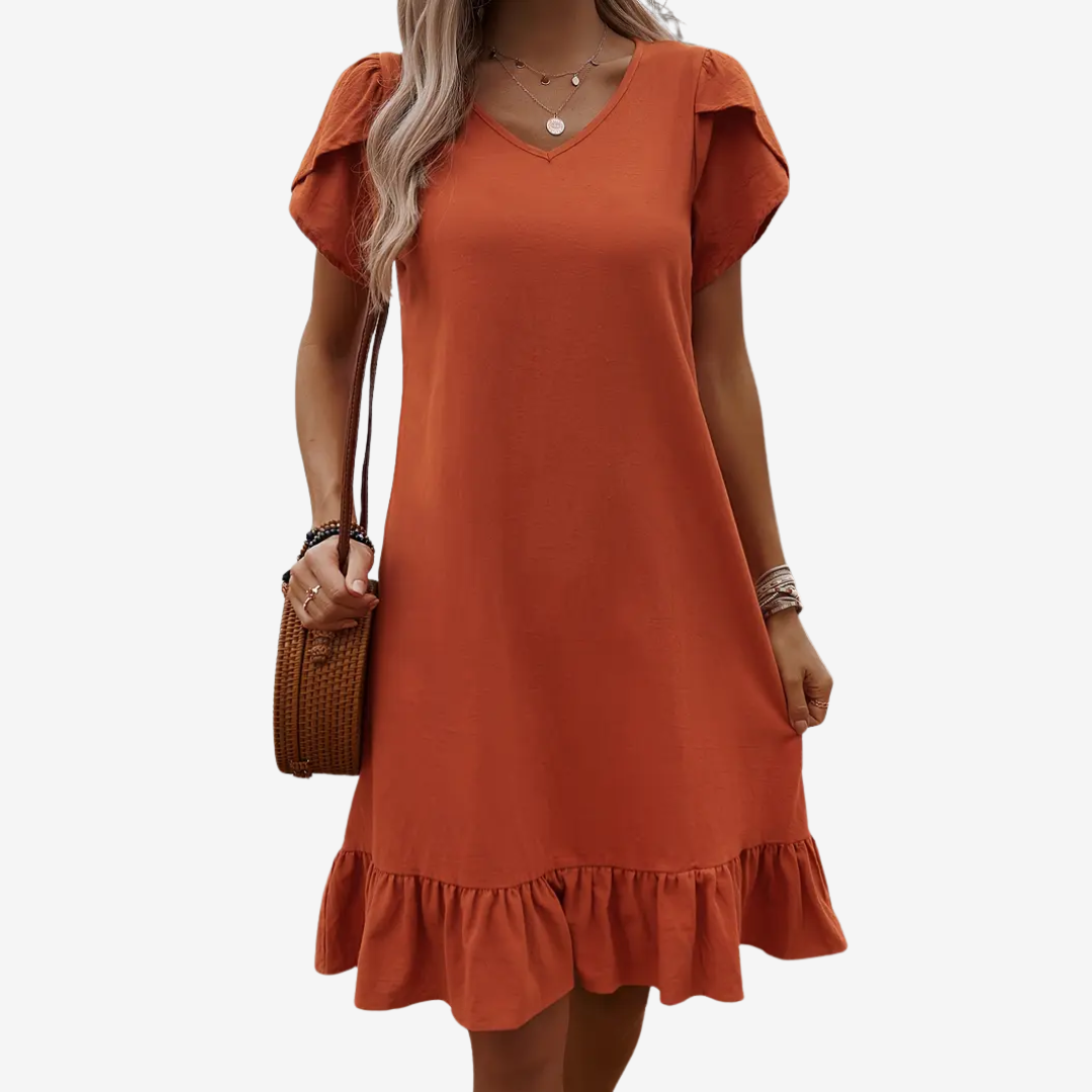 Apportez une touche de charme naturel à votre garde-robe avec Estara™, la robe fluide à ourlet volanté qui attire tous les regards grâce à sa coupe féminine et ses couleurs vibrantes. Son décolleté en V flatteur et ses manches courtes flottantes vous invitent à la douceur et au romantisme, tandis que son tissu léger vous assure un confort optimal tout au long de la journée. Idéale pour un brunch en amoureux, une balade en vacances ou une douce soirée d'été, Estara™ allie polyvalence et élégance pour une allure élégante et assurée à chaque tenue.