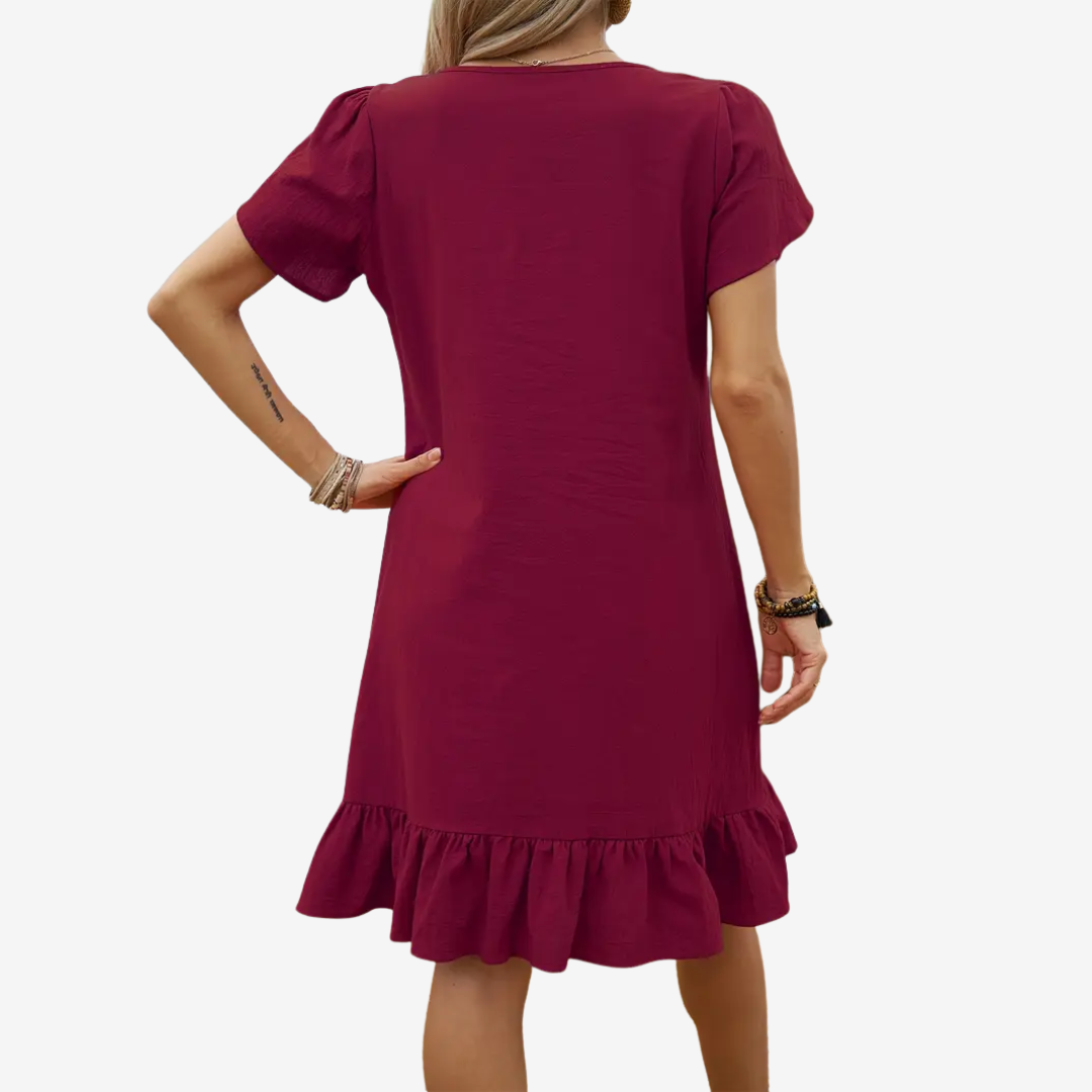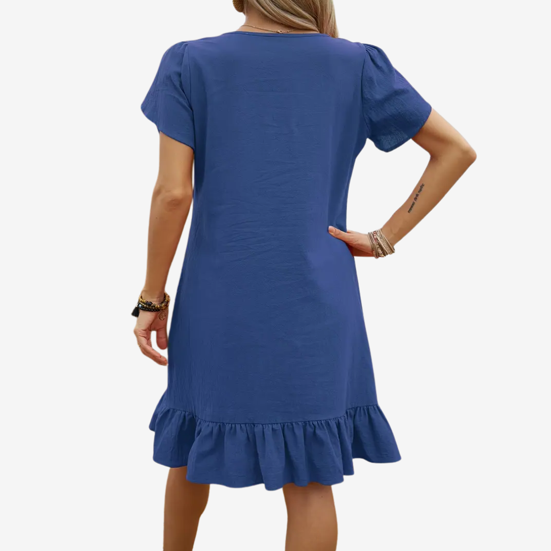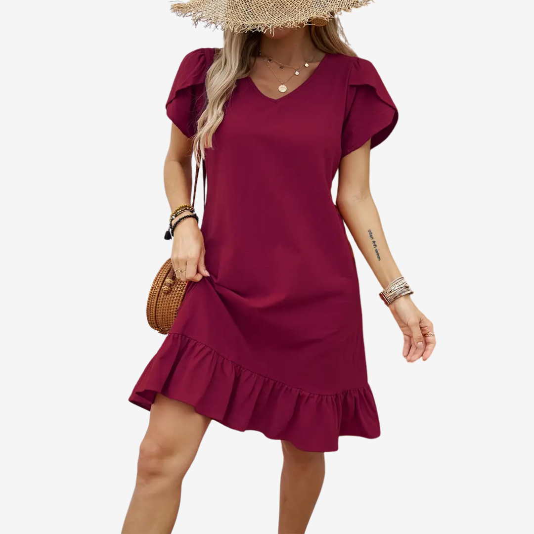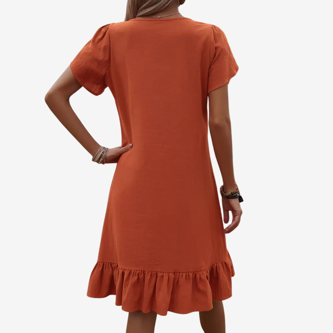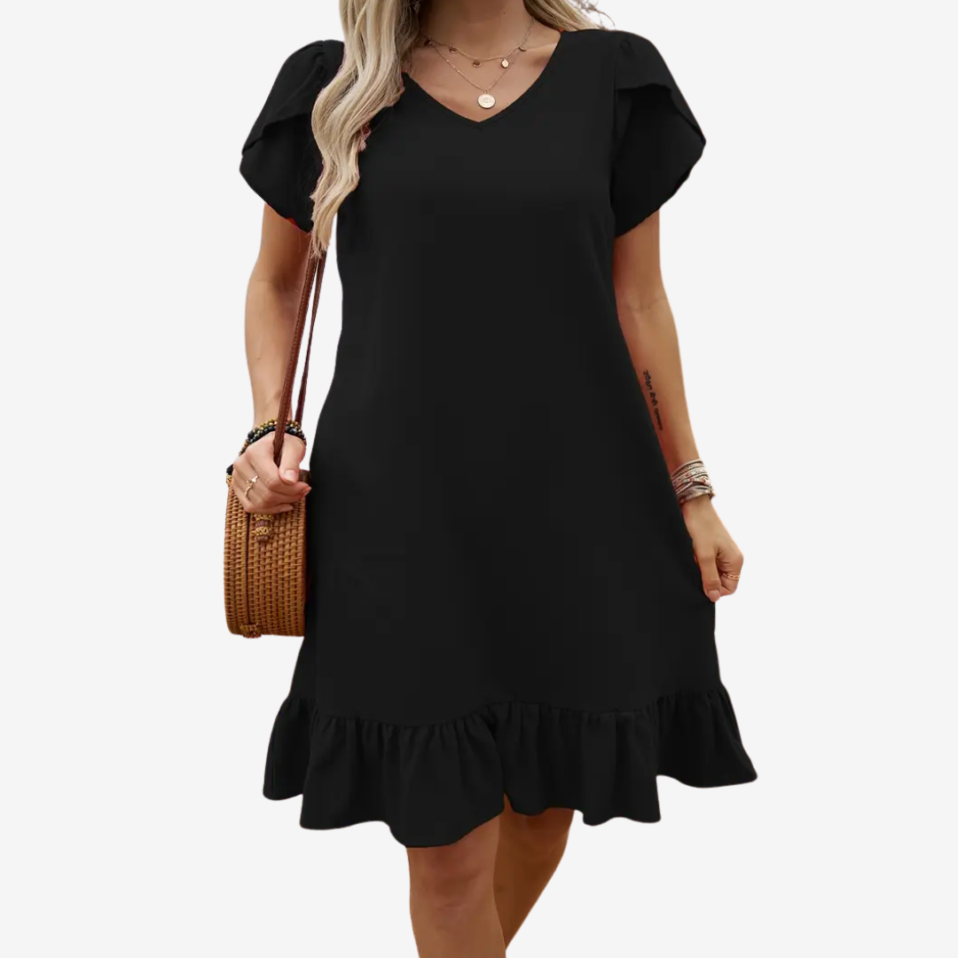 Apportez une touche de charme naturel à votre garde-robe avec Estara™, la robe fluide à ourlet volanté qui attire tous les regards grâce à sa coupe féminine et ses couleurs vibrantes. Son décolleté en V flatteur et ses manches courtes flottantes vous invitent à la douceur et au romantisme, tandis que son tissu léger vous assure un confort optimal tout au long de la journée. Idéale pour un brunch en amoureux, une balade en vacances ou une douce soirée d'été, Estara™ allie polyvalence et élégance pour une allure élégante et assurée à chaque tenue.