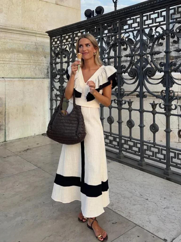Francoise | Élégante robe midi en patchwork avec volants et taille haute