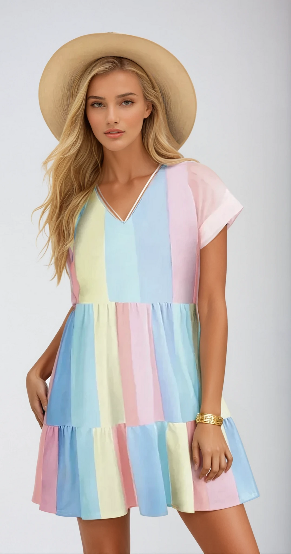 Illuminez votre été avec Geneviève, la robe mini à col en V et blocs de couleur, conçue pour apporter une élégance vibrante à votre garde-robe. Son design audacieux, sa coupe flatteuse et son tissu léger en font la pièce parfaite pour une promenade en bord de mer, un pique-nique dans un jardin ou une journée décontractée entre amis.
