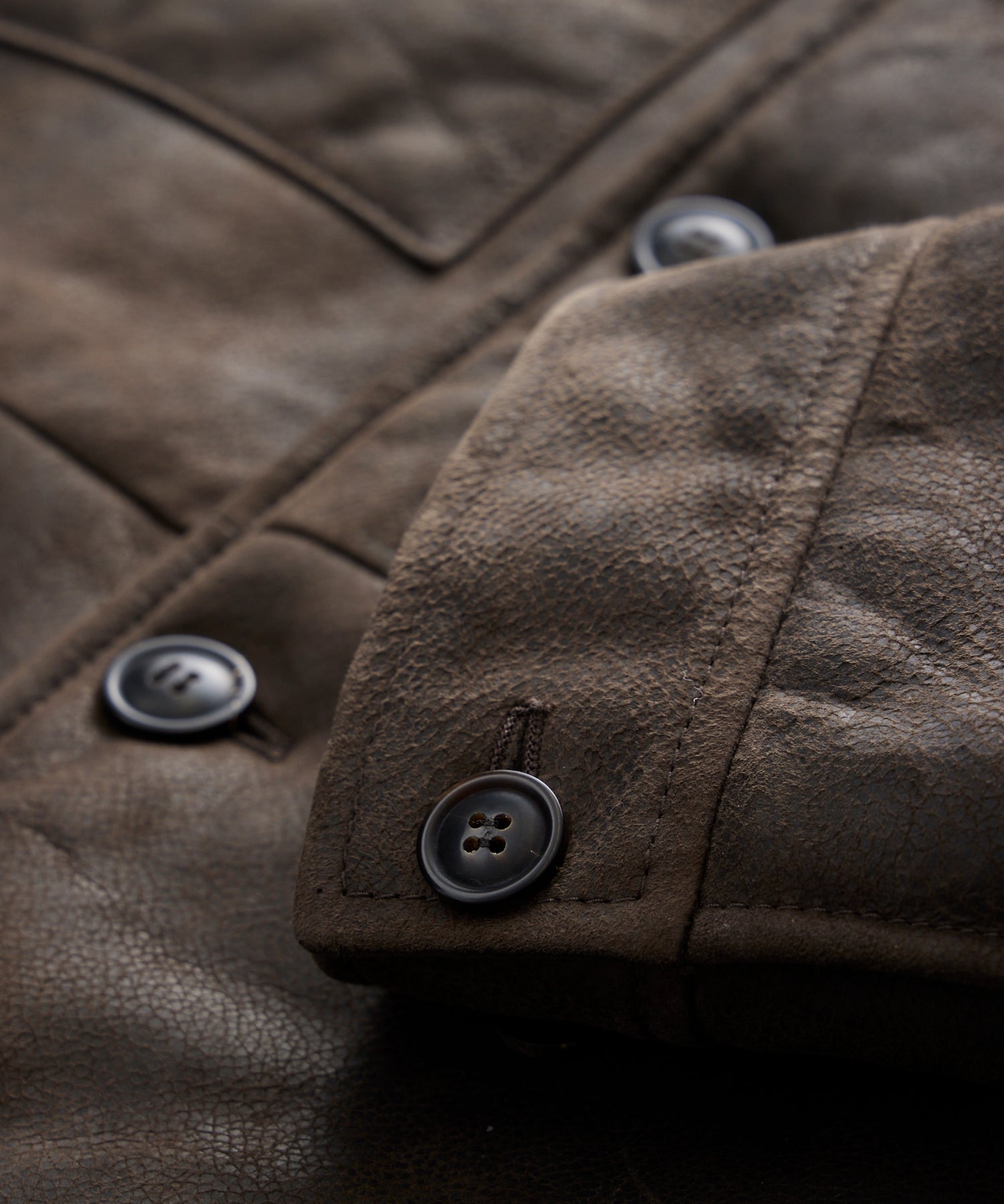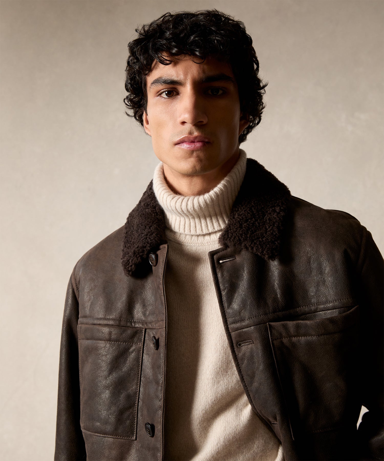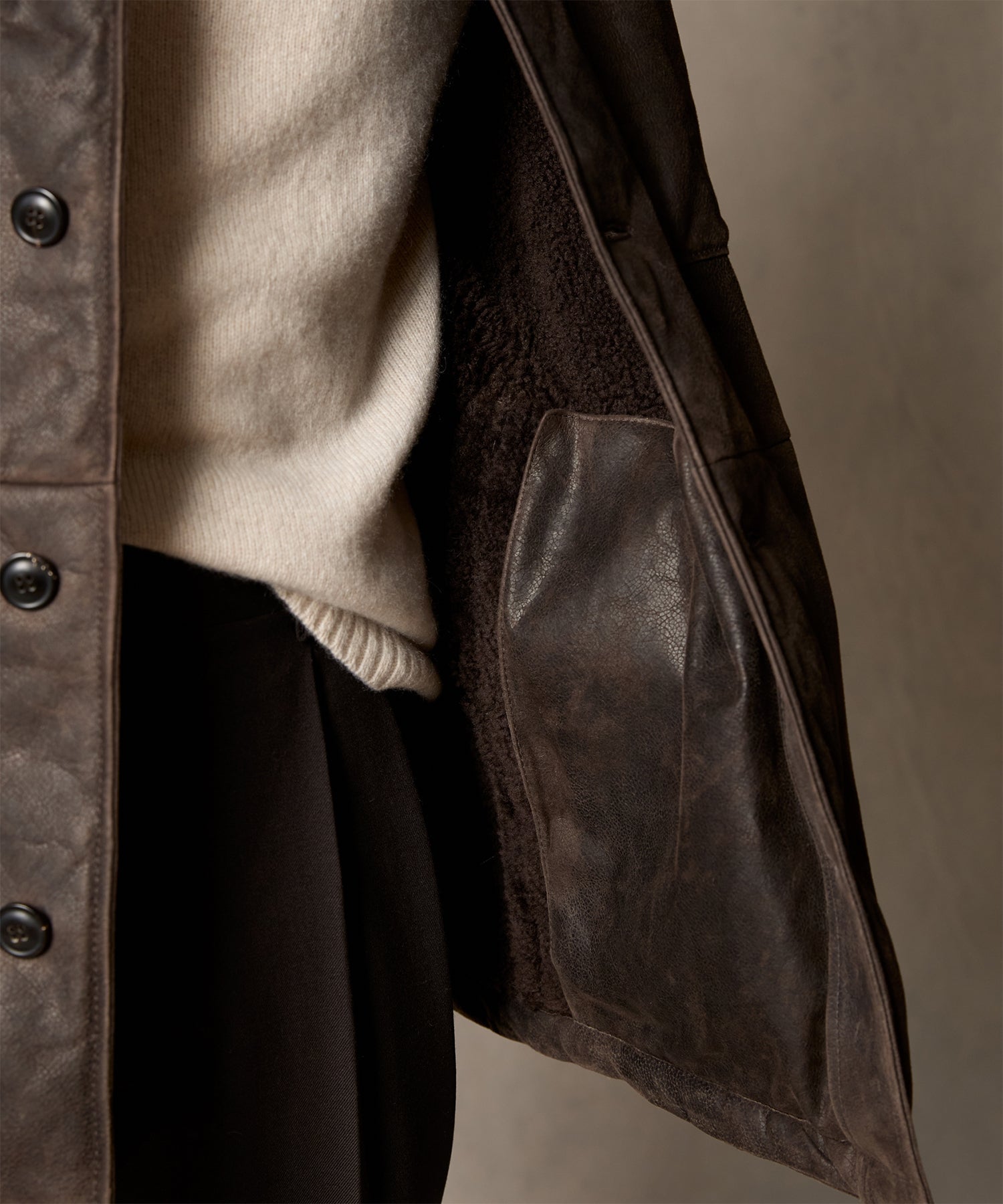 La veste Grey réinvente la silhouette classique Chore avec une doublure en shearling et cuir de qualité supérieure. Fabriquée en Italie, elle offre un confort optimal et une grande fonctionnalité. Parfaite pour les températures froides, elle allie utilité et style raffiné.