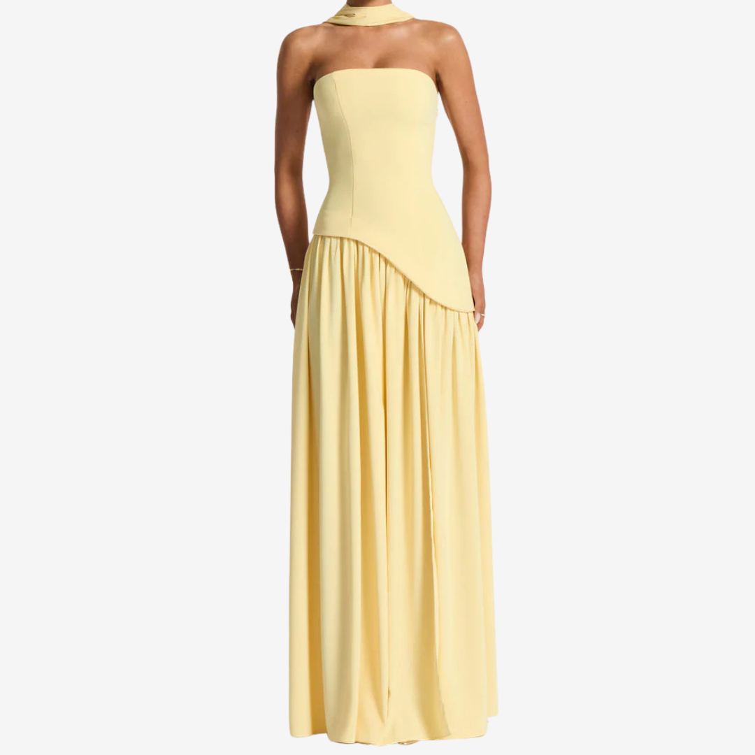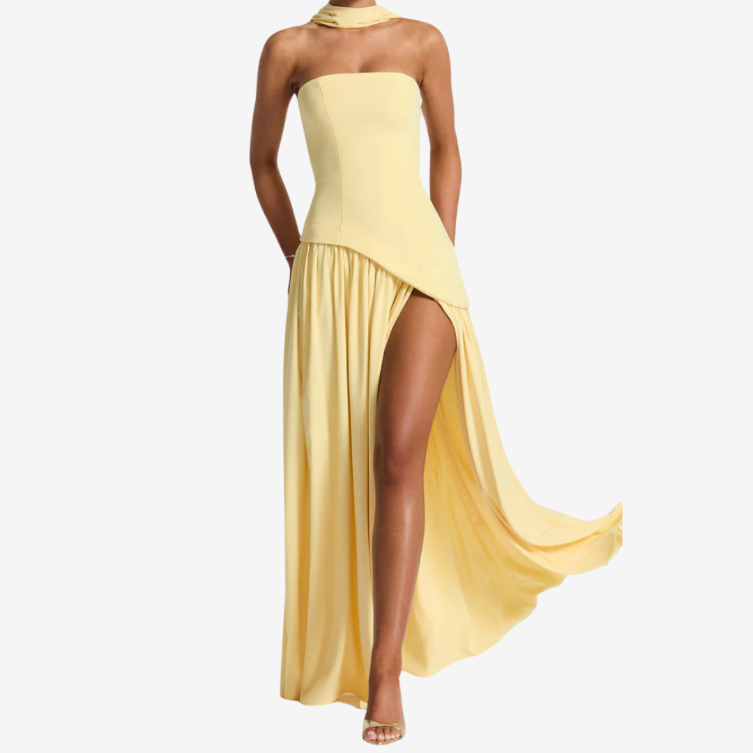 Plongez sous les projecteurs avec Josette™, une robe bustier jaune beurre époustouflante, qui rayonne de chaleur, de grâce et de sophistication moderne. Cette pièce spectaculaire arbore un foulard drapé saisissant sur une épaule, créant mouvement et allure à votre démarche. Son corsage légèrement plissé et sa fente jusqu'aux cuisses subliment votre silhouette tout en lui conférant une allure aérienne et aérienne. Parfaite pour les galas, les mariages ou tout événement qui exige une énergie divine.