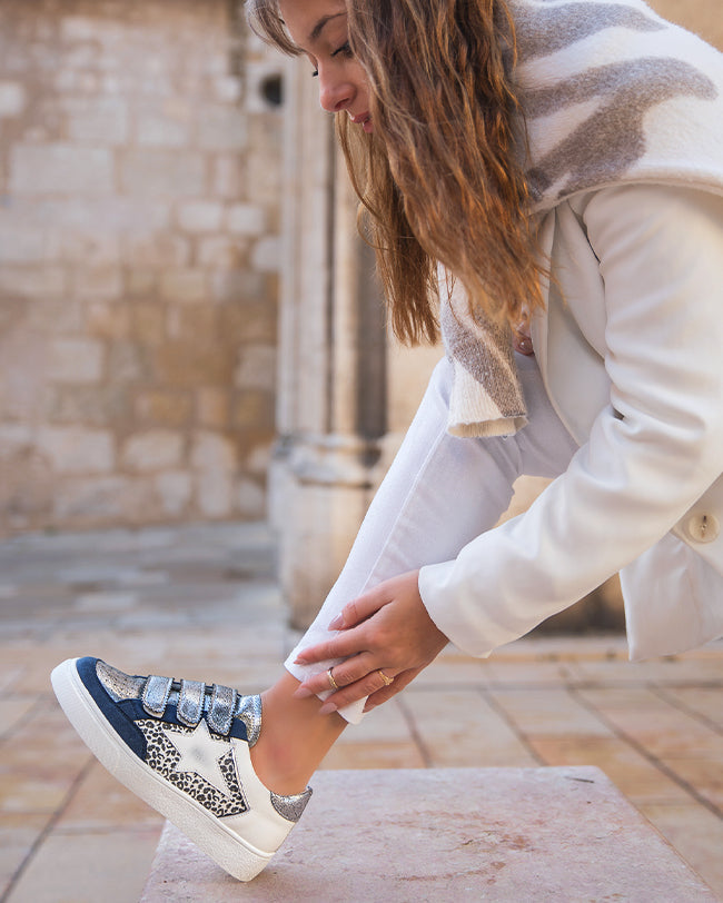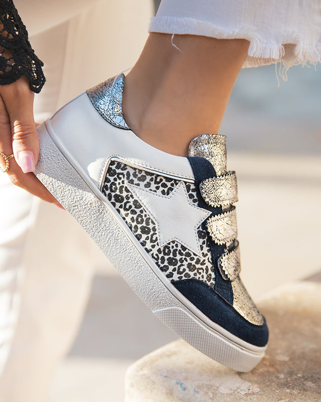Affirmez votre personnalité avec les baskets Julie, une fusion parfaite entre mode contemporaine et design audacieux. Avec leur étoile vieillie et leur motif léopard, elles apportent une touche de caractère à toutes vos tenues. Les détails argentés craquelés sur le contrefort arrière, la languette et les scratchs de fermeture ajoutent une finition unique et sophistiquée. L'effet en suédine bleue sur le contrefort avant et le garant renforce leur élégance intemporelle.