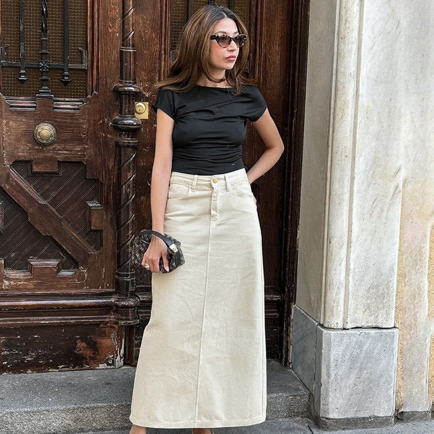 Jupe midi femme – Coton 100% – Coupe slim – Taille haute – Fente avant élégante
