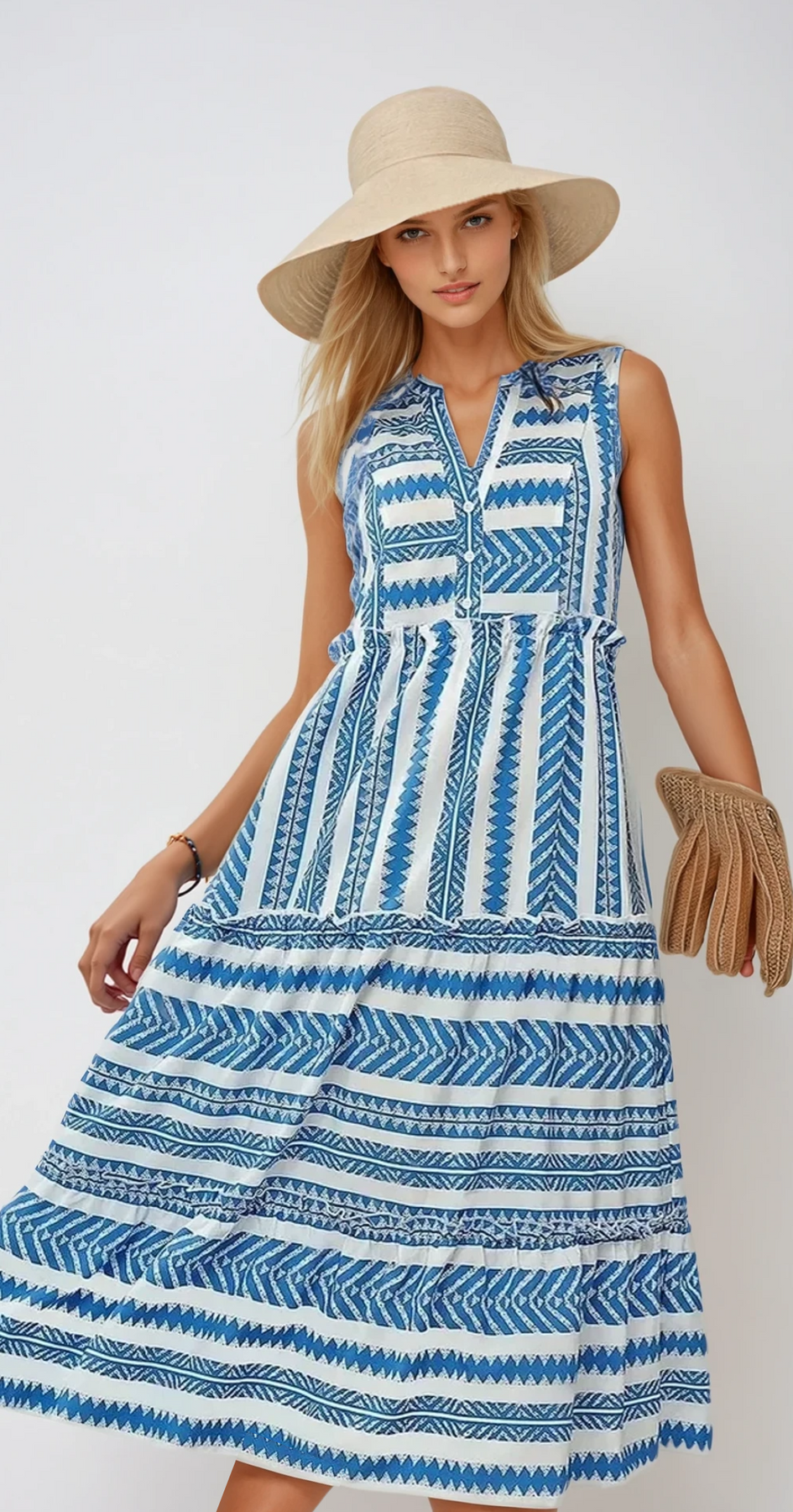 Célébrez la saison ensoleillée avec Léonie, la robe d'été sans manches à volants, idéale pour allier fraîcheur et style. Son design fluide, ses détails délicats et son tissu léger font d’Léonie une compagne parfaite pour vos journées au soleil, qu’il s’agisse d’une promenade en bord de mer ou d’un brunch au jardin. Une robe pensée pour vous faire rayonner en toute simplicité.