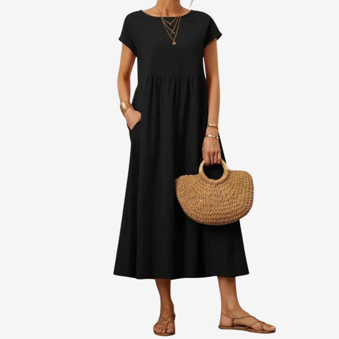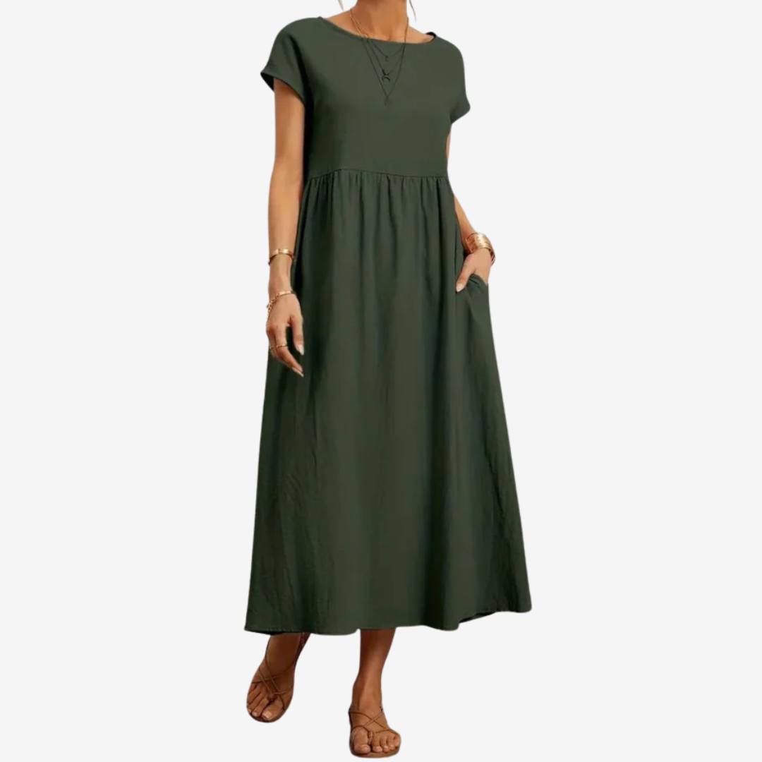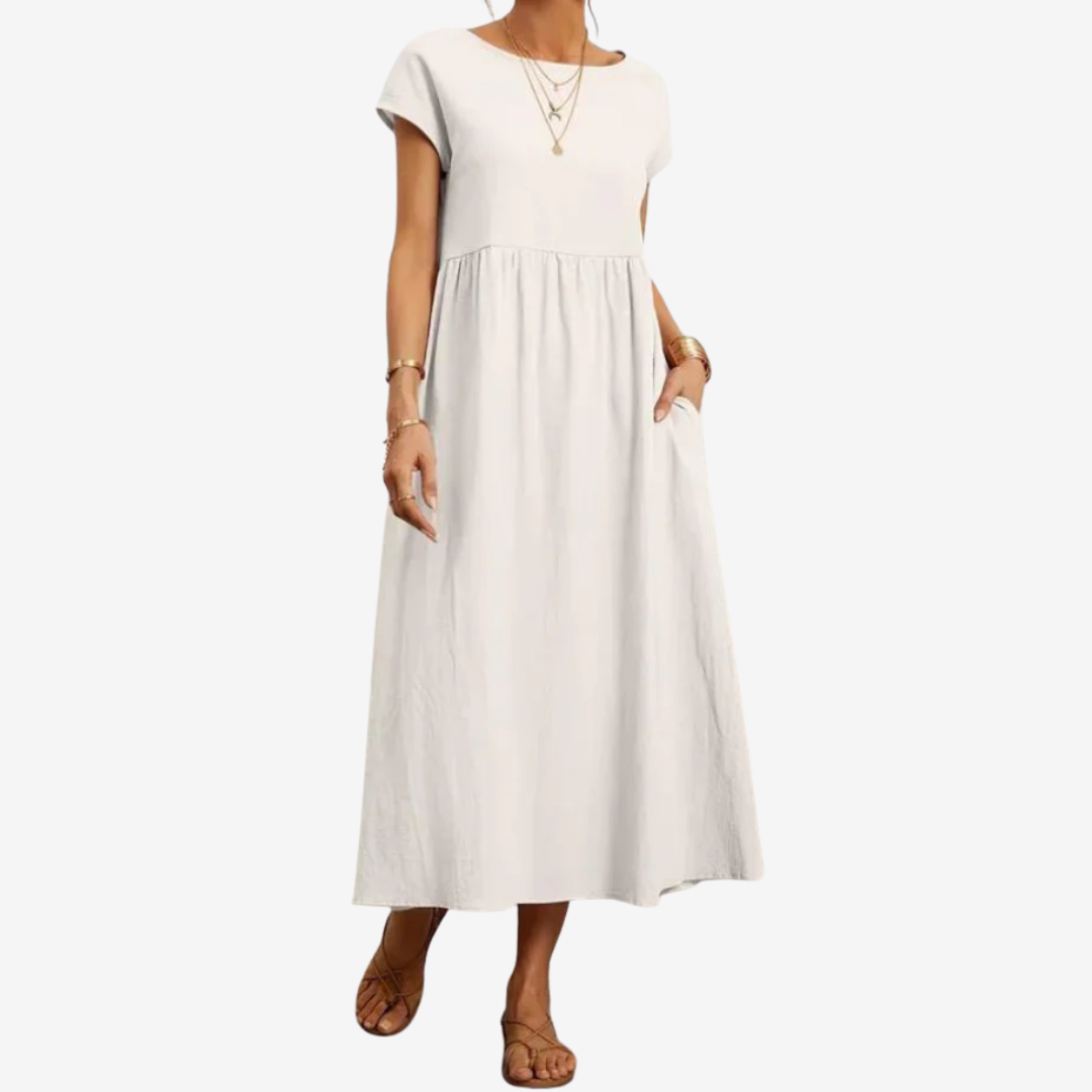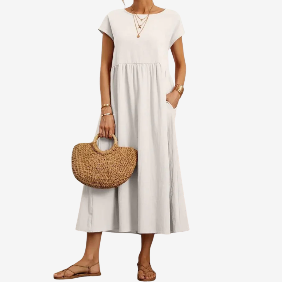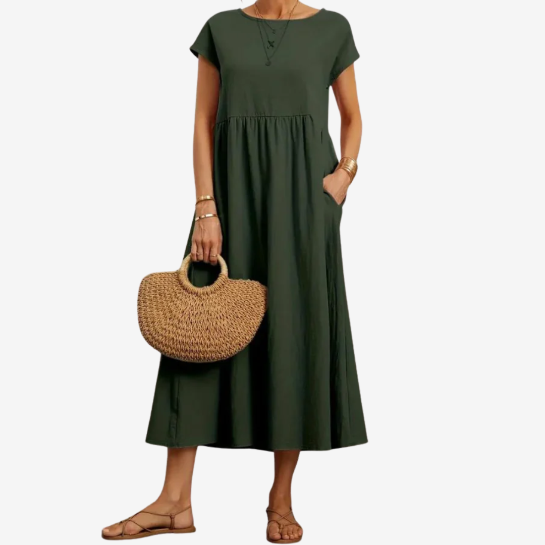 Découvrez la robe Lysiane™, un mélange naturel de confort et d'élégance. Confectionnée dans une matière respirante, cette robe midi présente une encolure dégagée délicate, des manches courtes et une taille décontractée qui se prolonge gracieusement en une jupe ample et aérienne. Ses poches latérales dissimulées lui confèrent un charme pratique, tandis que sa silhouette fluide crée du mouvement à chaque pas. Idéale pour les journées ensoleillées ou les soirées décontractées, Lysiane™ incarne la sophistication simple.