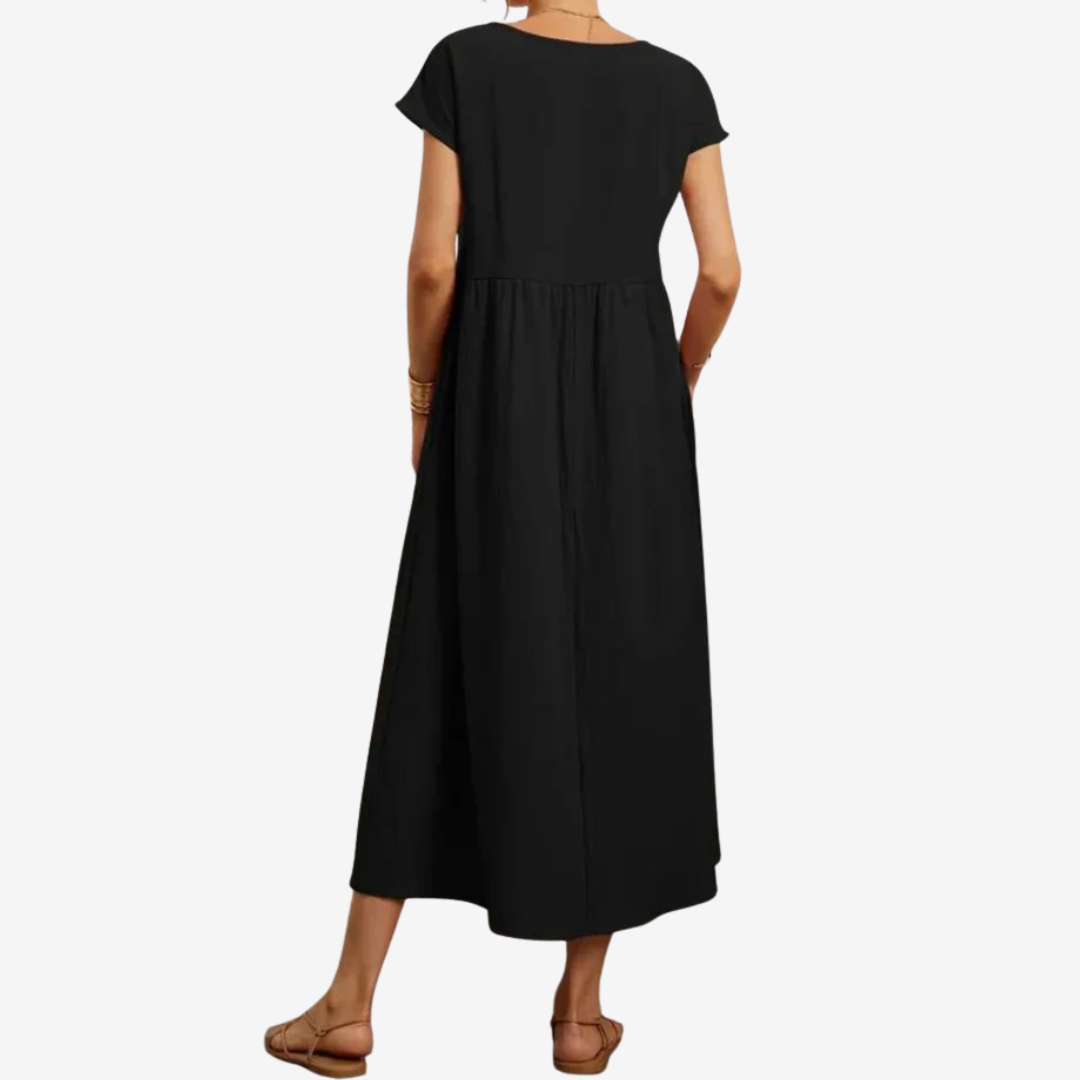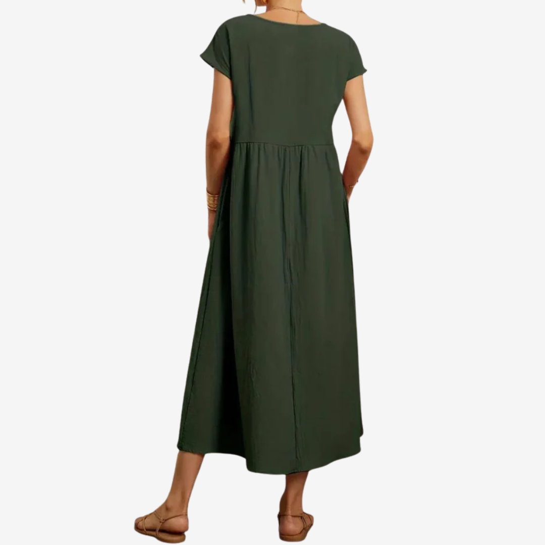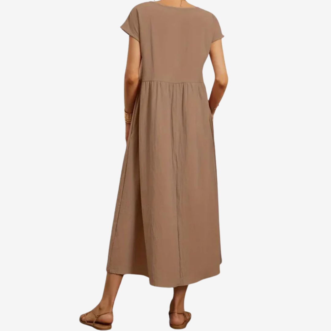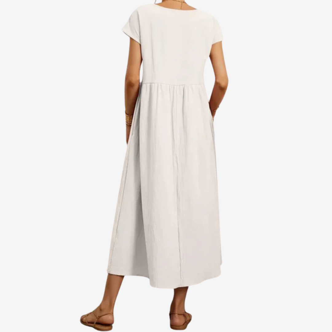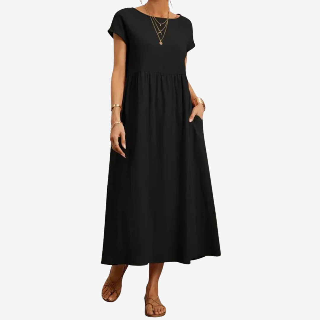 Découvrez la robe Lysiane™, un mélange naturel de confort et d'élégance. Confectionnée dans une matière respirante, cette robe midi présente une encolure dégagée délicate, des manches courtes et une taille décontractée qui se prolonge gracieusement en une jupe ample et aérienne. Ses poches latérales dissimulées lui confèrent un charme pratique, tandis que sa silhouette fluide crée du mouvement à chaque pas. Idéale pour les journées ensoleillées ou les soirées décontractées, Lysiane™ incarne la sophistication simple.