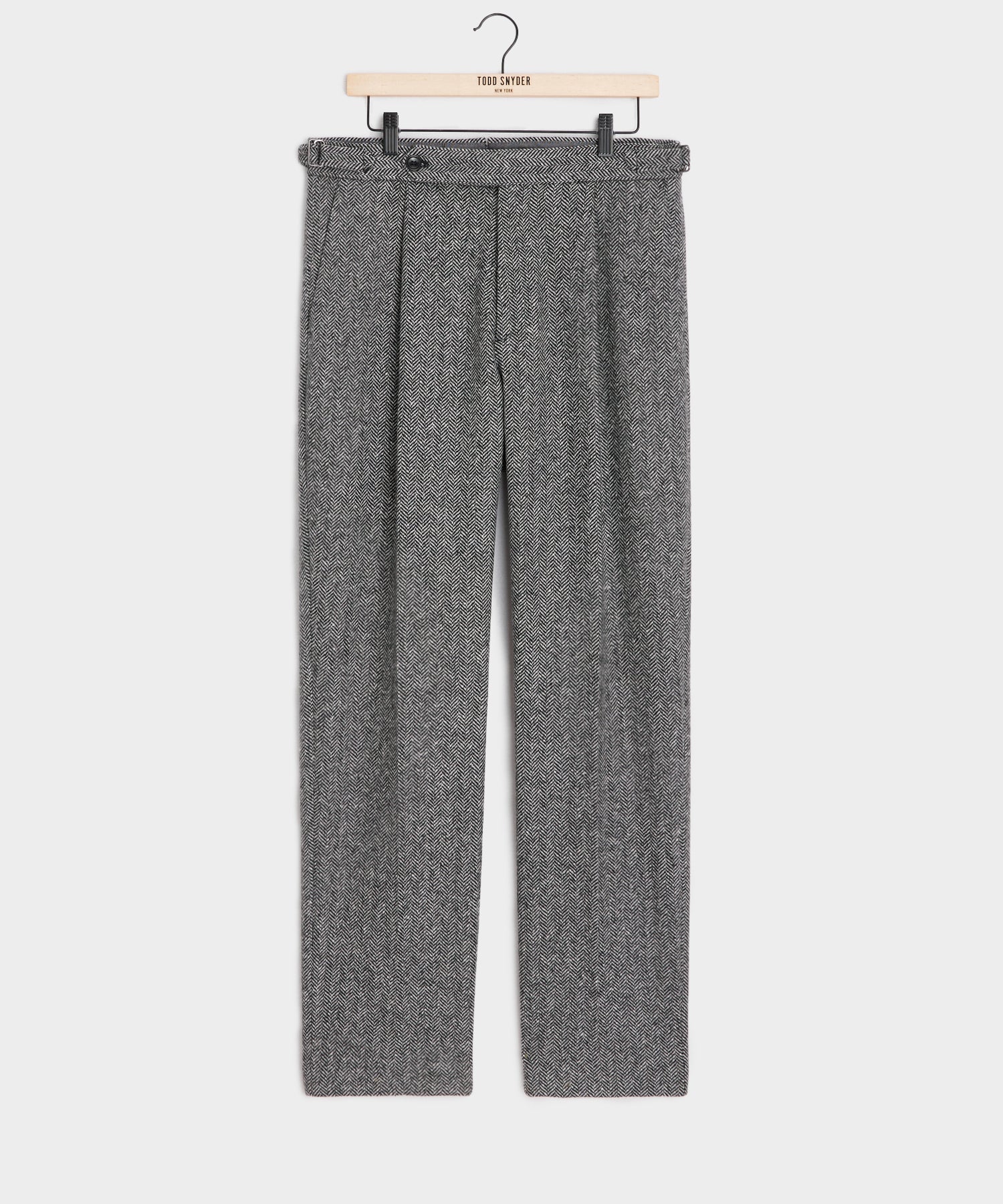 Le pantalon Mansur est confectionné dans un tissu en laine Donegal herringbone de qualité supérieure. Sa coupe élégante, avec des ajusteurs latéraux et une taille ajustée, apporte confort et sophistication. Ce pantalon polyvalent est idéal pour un look chic, tout en restant moderne et raffiné.