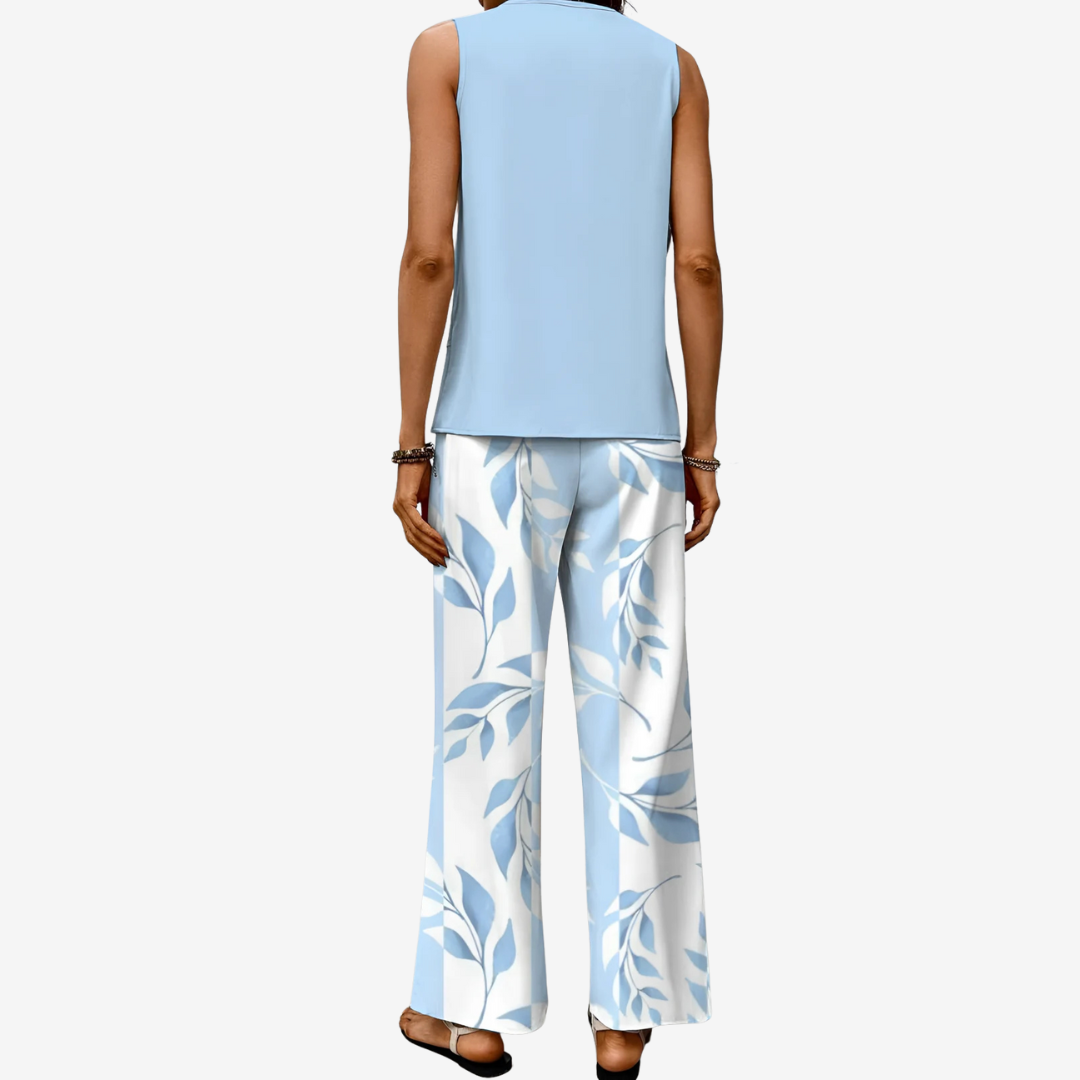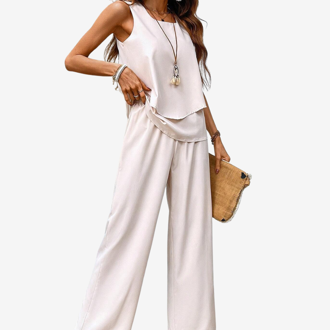 Conçu pour la femme moderne, cet ensemble se compose d'un haut sans manches et d'un pantalon assorti, confectionnés dans une matière haut de gamme, pour une tenue légère et aérienne. Parfait pour les chaudes journées d'été, il allie confort et sophistication, idéal pour de nombreuses occasions.