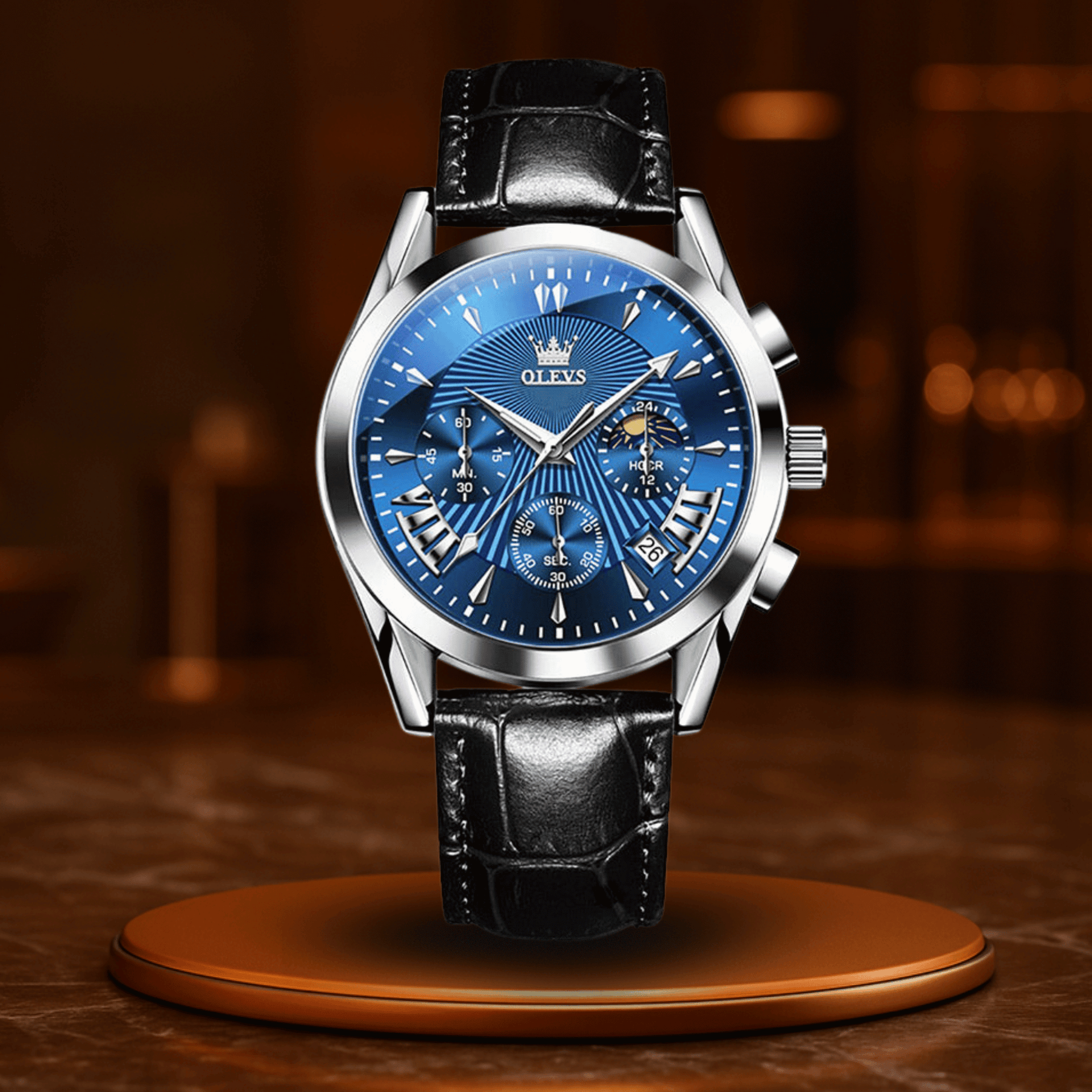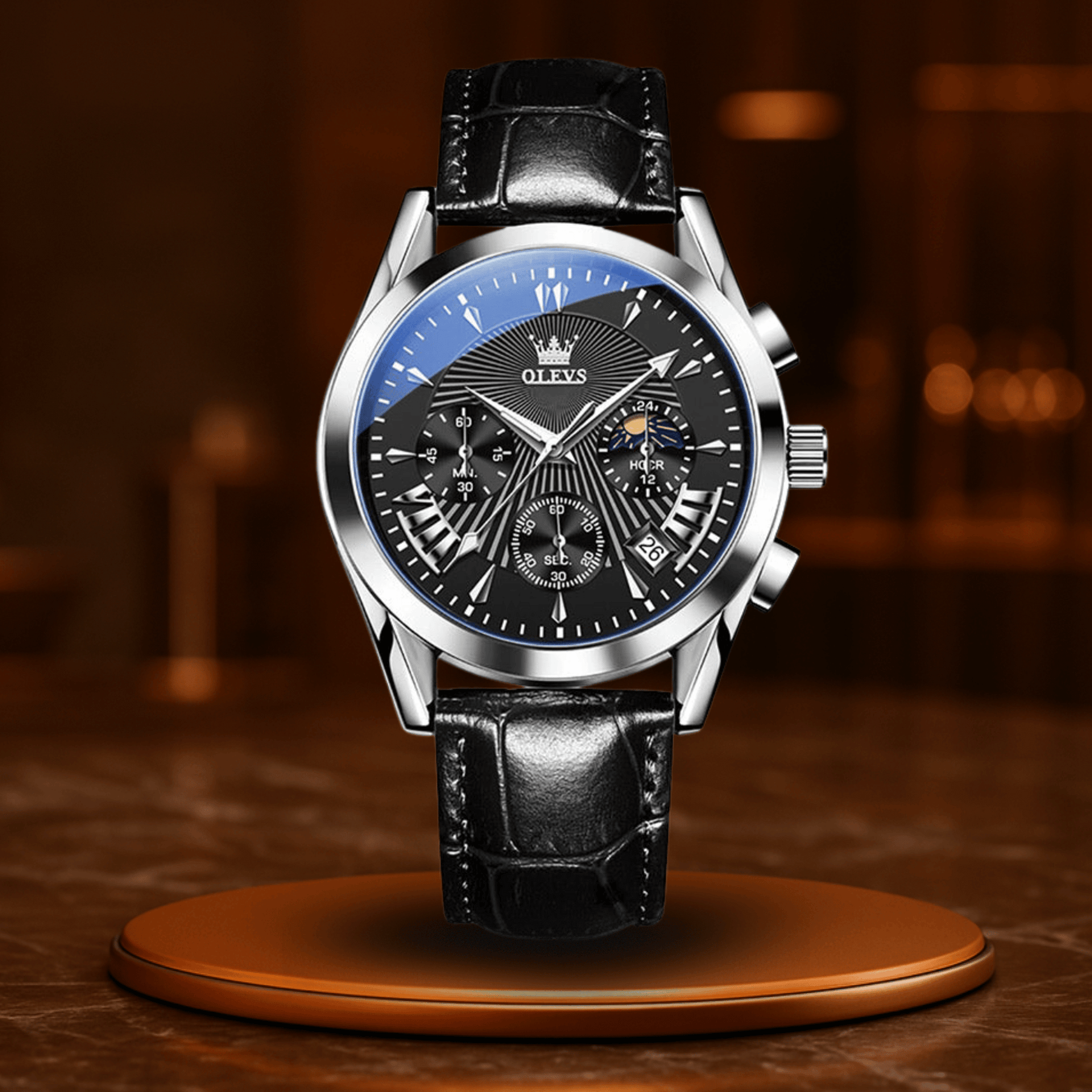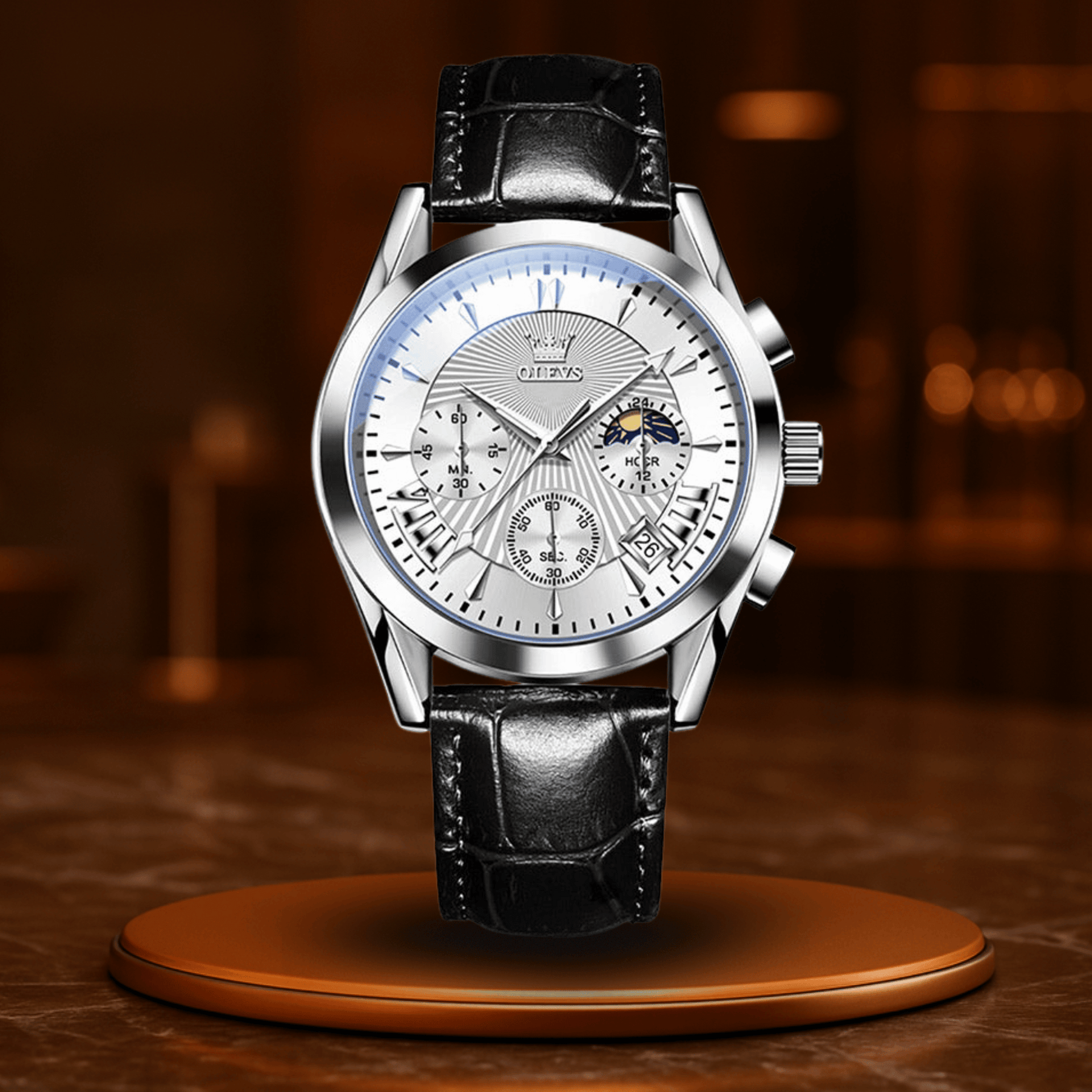 Avec son bracelet en cuir élégant, son mouvement quartz précis et ses nombreuses fonctions – chronographe, calendrier, aiguilles lumineuses – Michel-Ange™ est prête à t’accompagner dans chaque instant du quotidien. Pourtant, elle se distingue par une particularité unique : l’indicateur de phase lunaire, une fenêtre ouverte sur le ciel, encadrée d’acier inoxydable et de cuir véritable.
