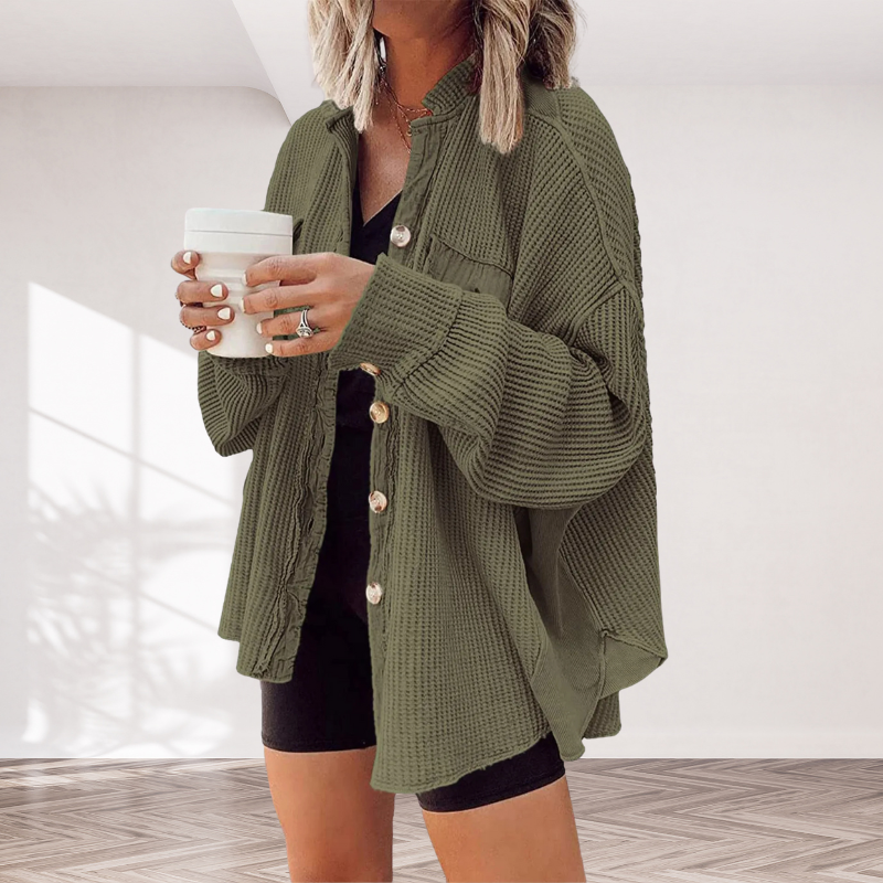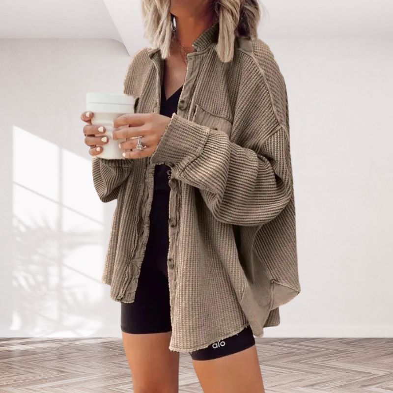 La Nova Waffle Knit Shacket est le mélange idéal entre une chemise et une veste, parfaite pour l'automne et l'hiver. Avec sa coupe ample et sa structure gaufrée douce, elle offre à la fois chaleur et confort. Les manches longues et les subtiles fentes lui confèrent un look moderne et décontracté qui se combine facilement avec un jean, un legging ou une jupe. Un indispensable polyvalent pour celles qui veulent sortir avec style et décontraction.