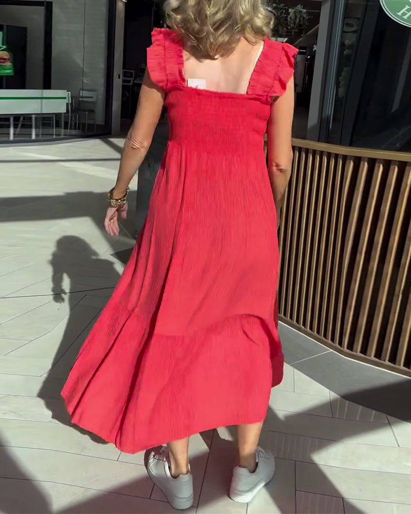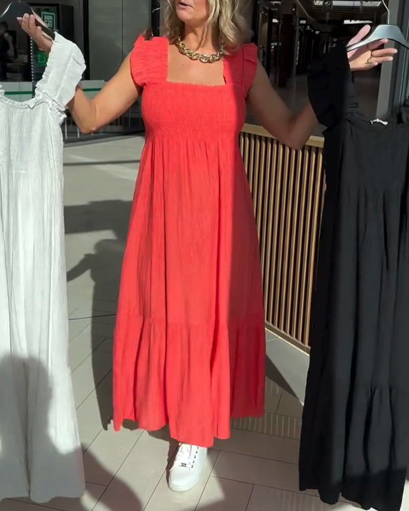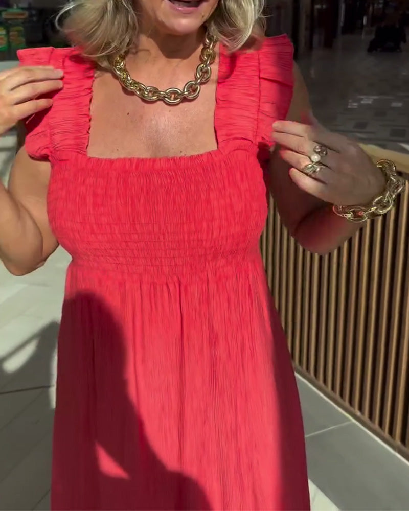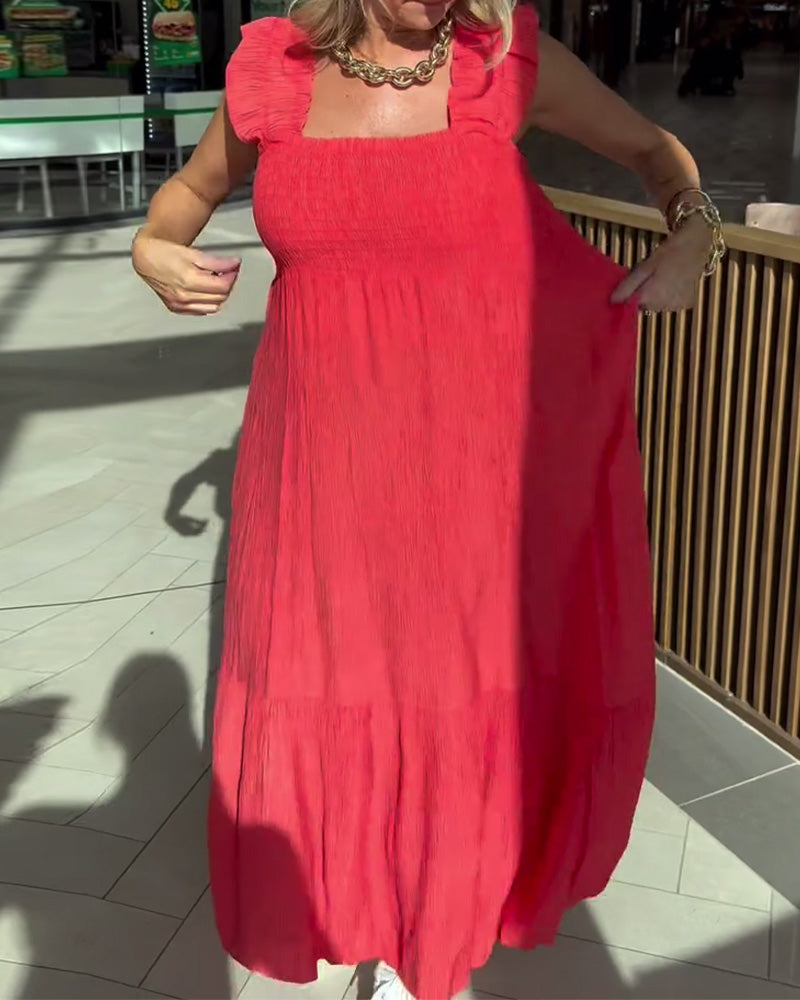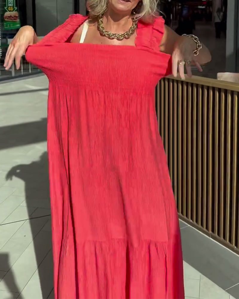 Robe A-Ligne Couleur Unie Plissée Bretelle