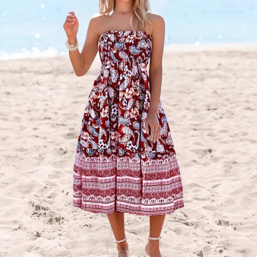 Robe Bandeau Femme – Coupe Évasée – Motif Floral – Longueur Midi – Convertible