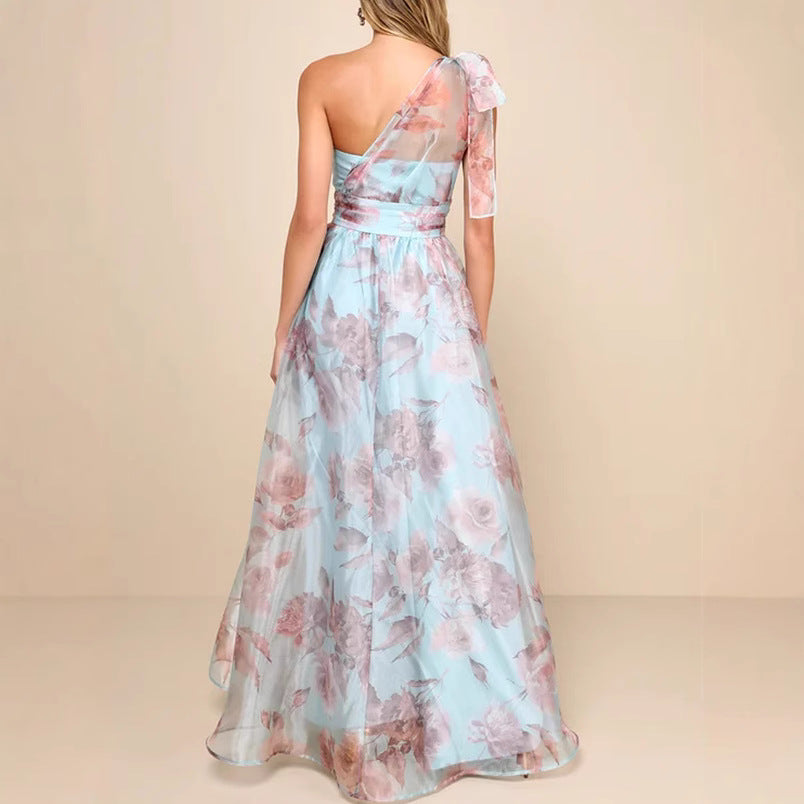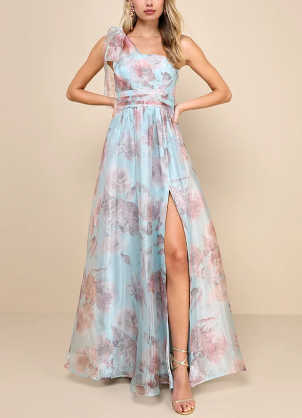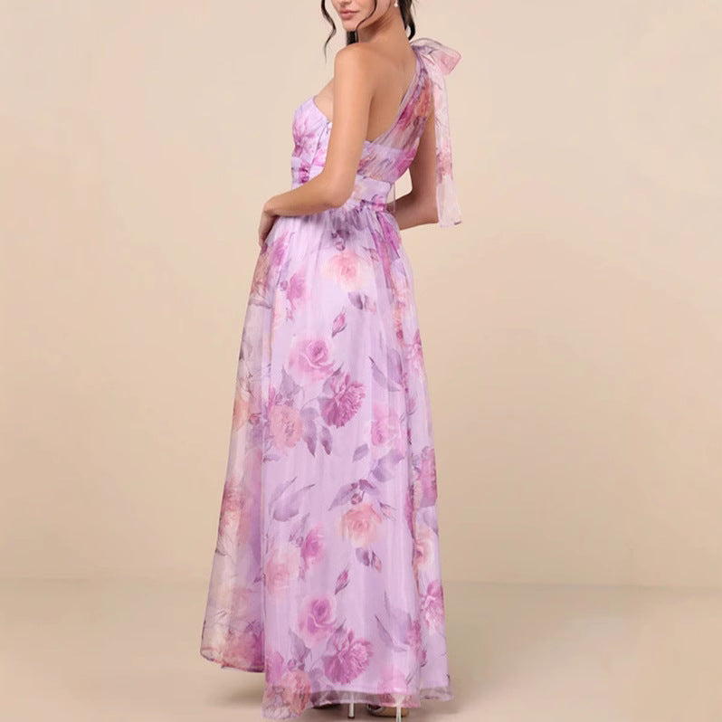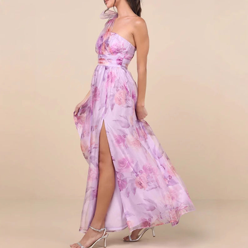Robe de soirée femme – Chiffon fluide – Une épaule – Imprimé floral – Fente haute