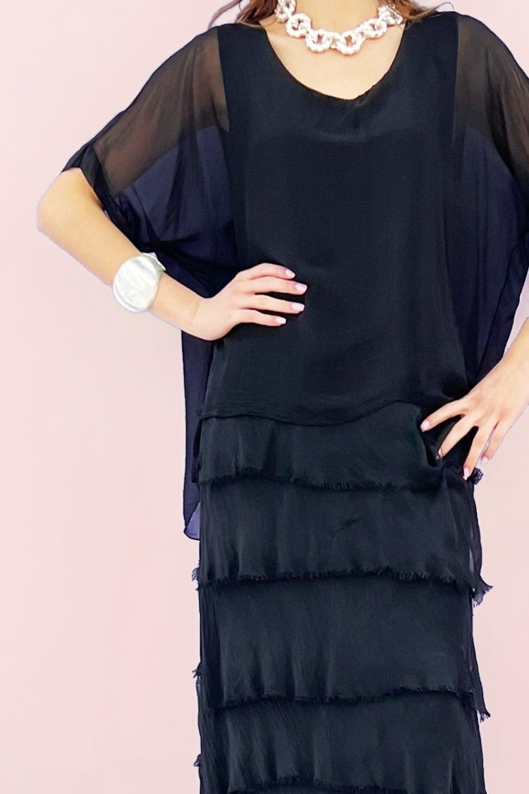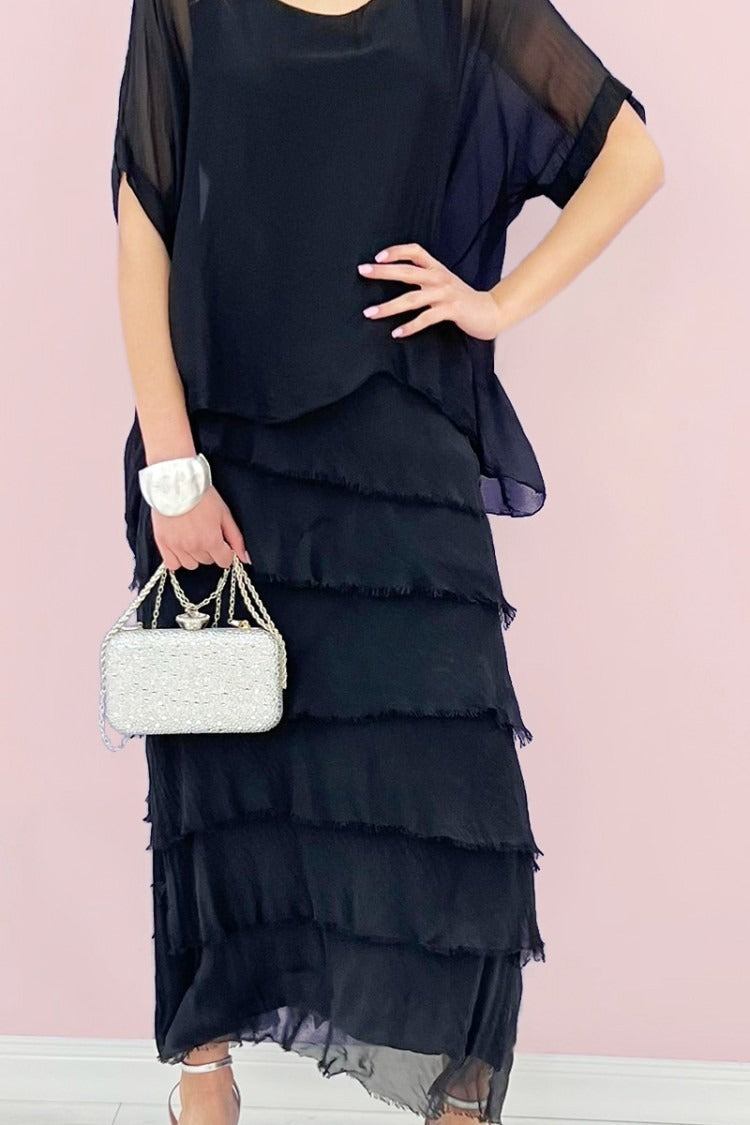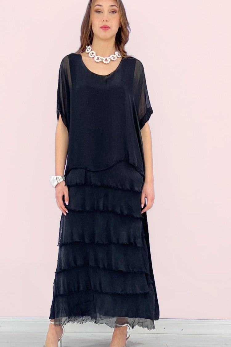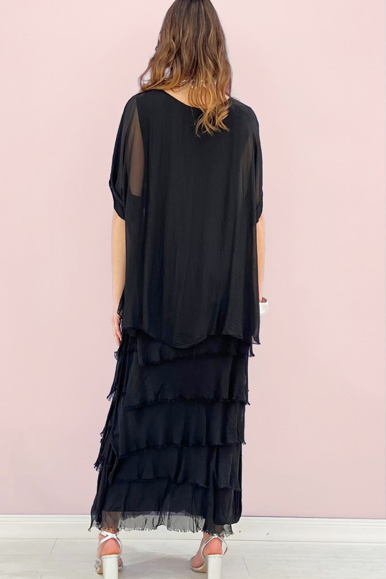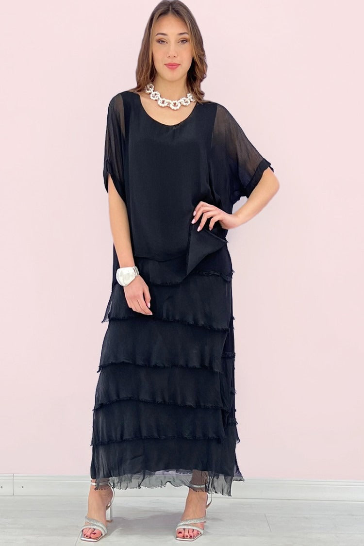 Cette robe officielle en soie à volants allie élégance et confort, parfaite pour une occasion spéciale ou un événement formel. Avec sa coupe fluide et ses détails raffinés, elle met en valeur toutes les silhouettes, du modèle régulier au modèle curvy.
