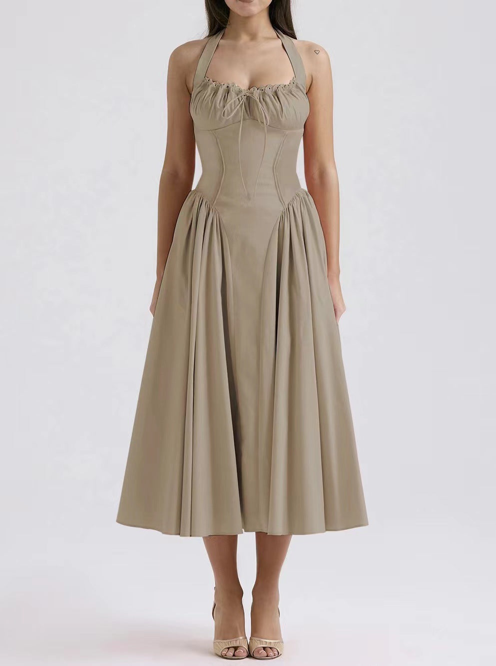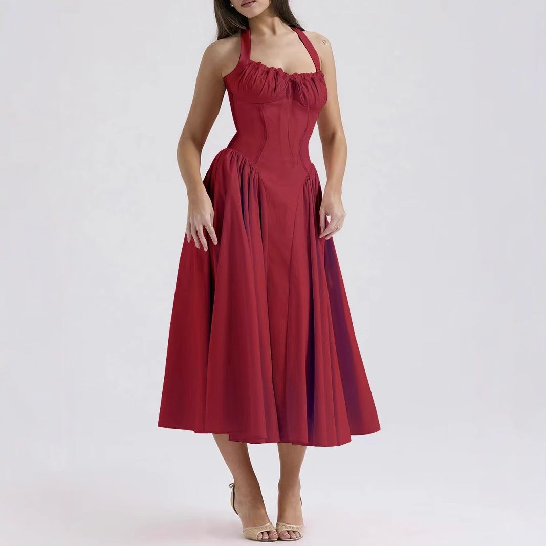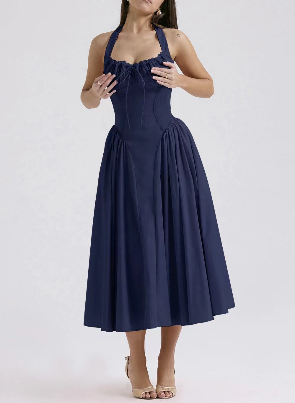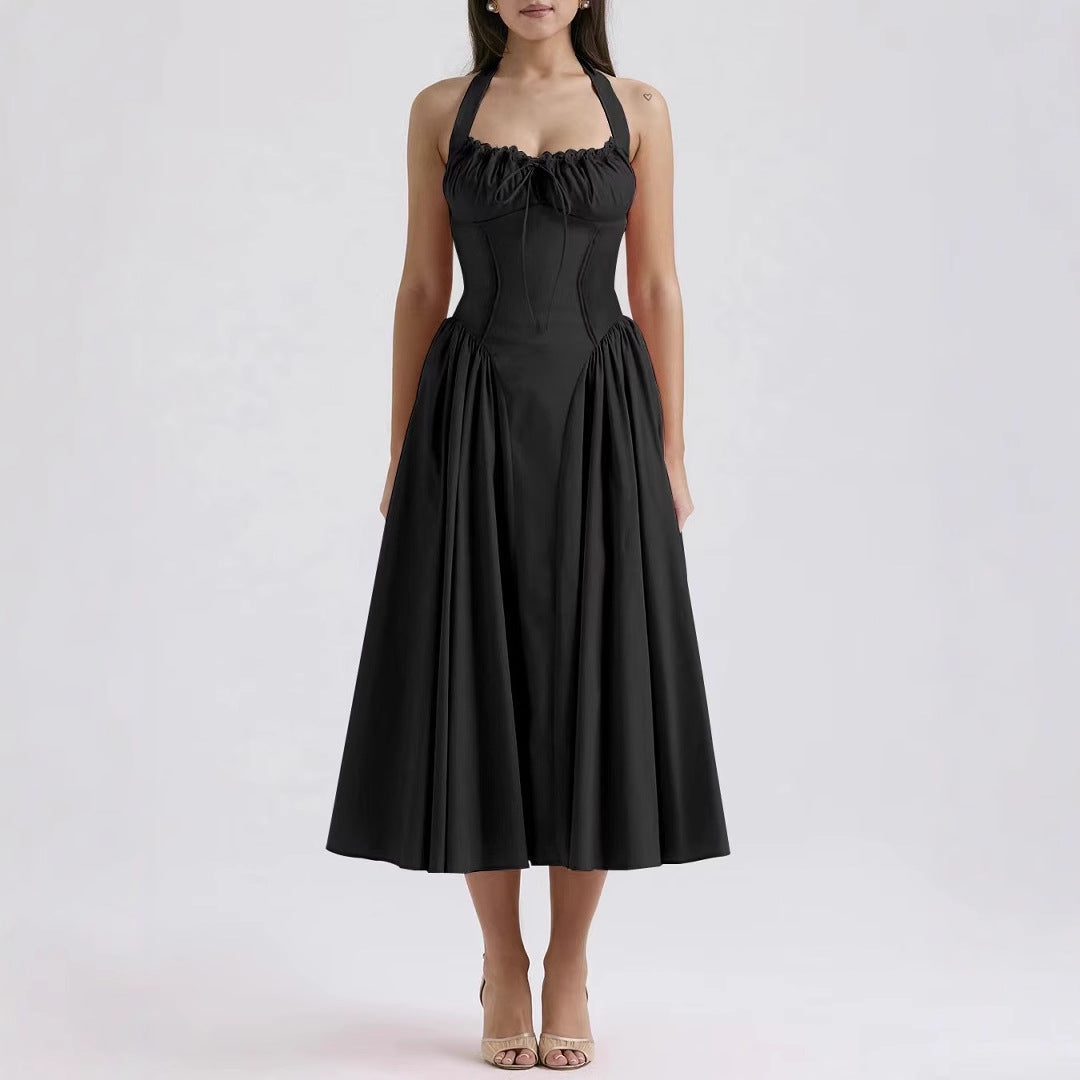 Robe femme à col halter – Coupe ajustée – Dos nu – Jupe midi évasée élégante