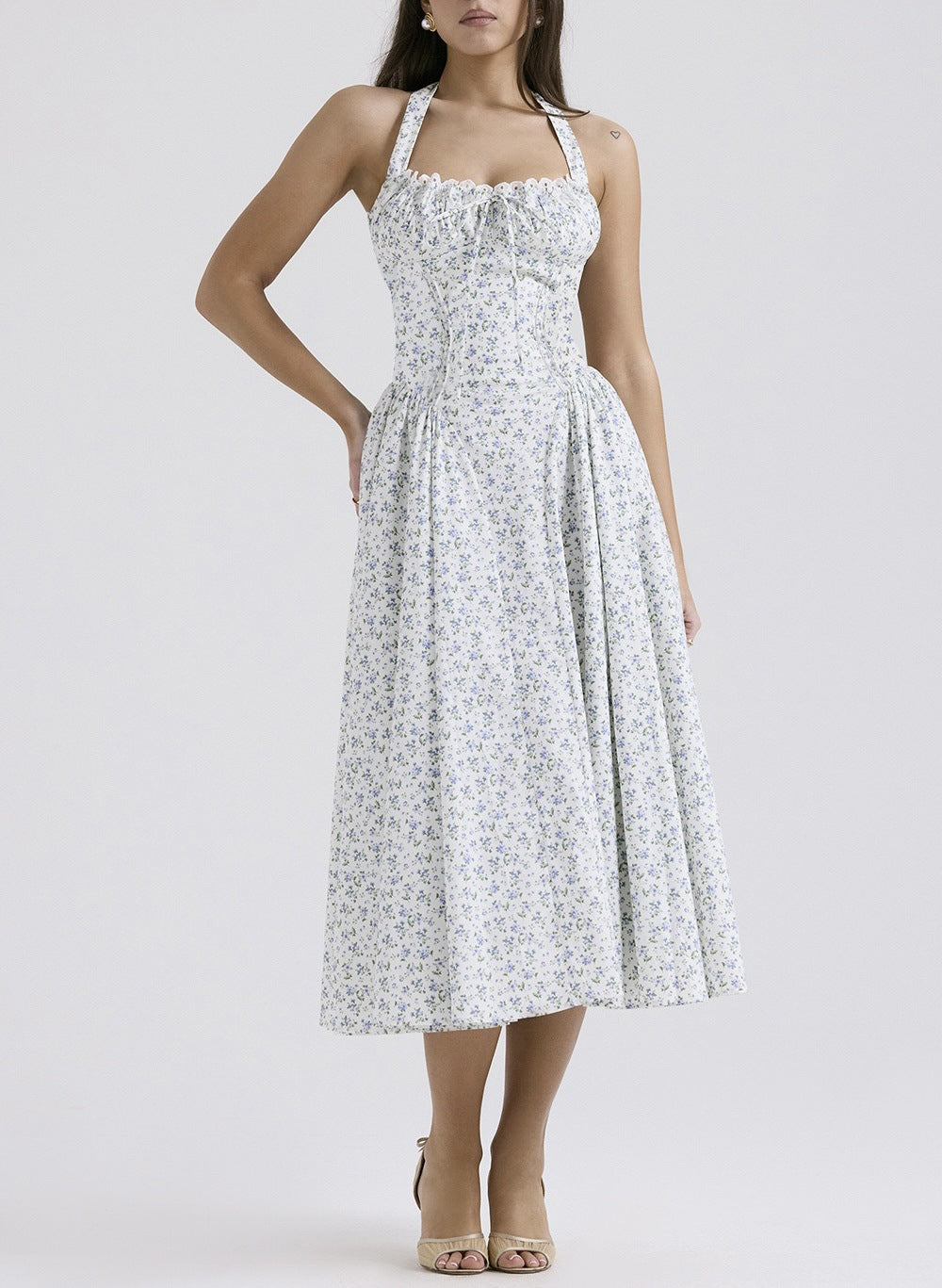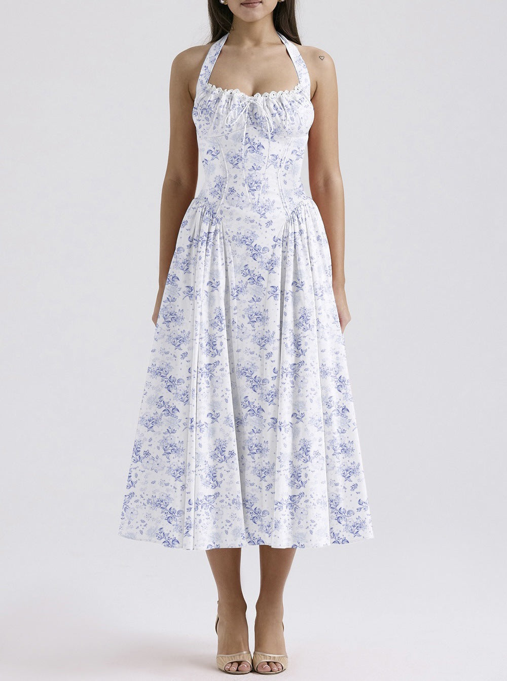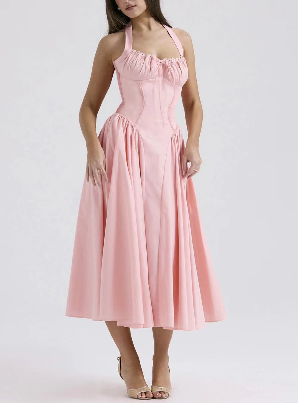 Robe femme à col halter – Coupe ajustée – Dos nu – Jupe midi évasée élégante