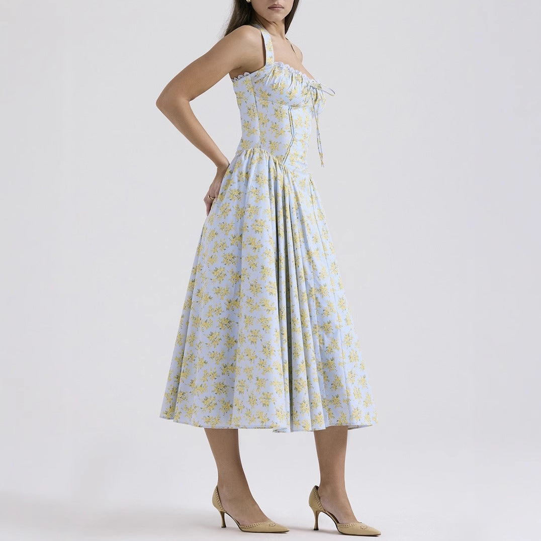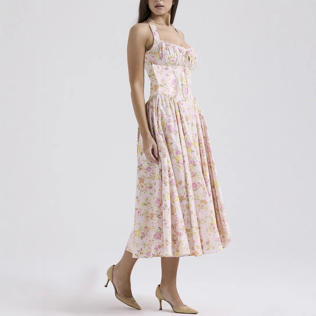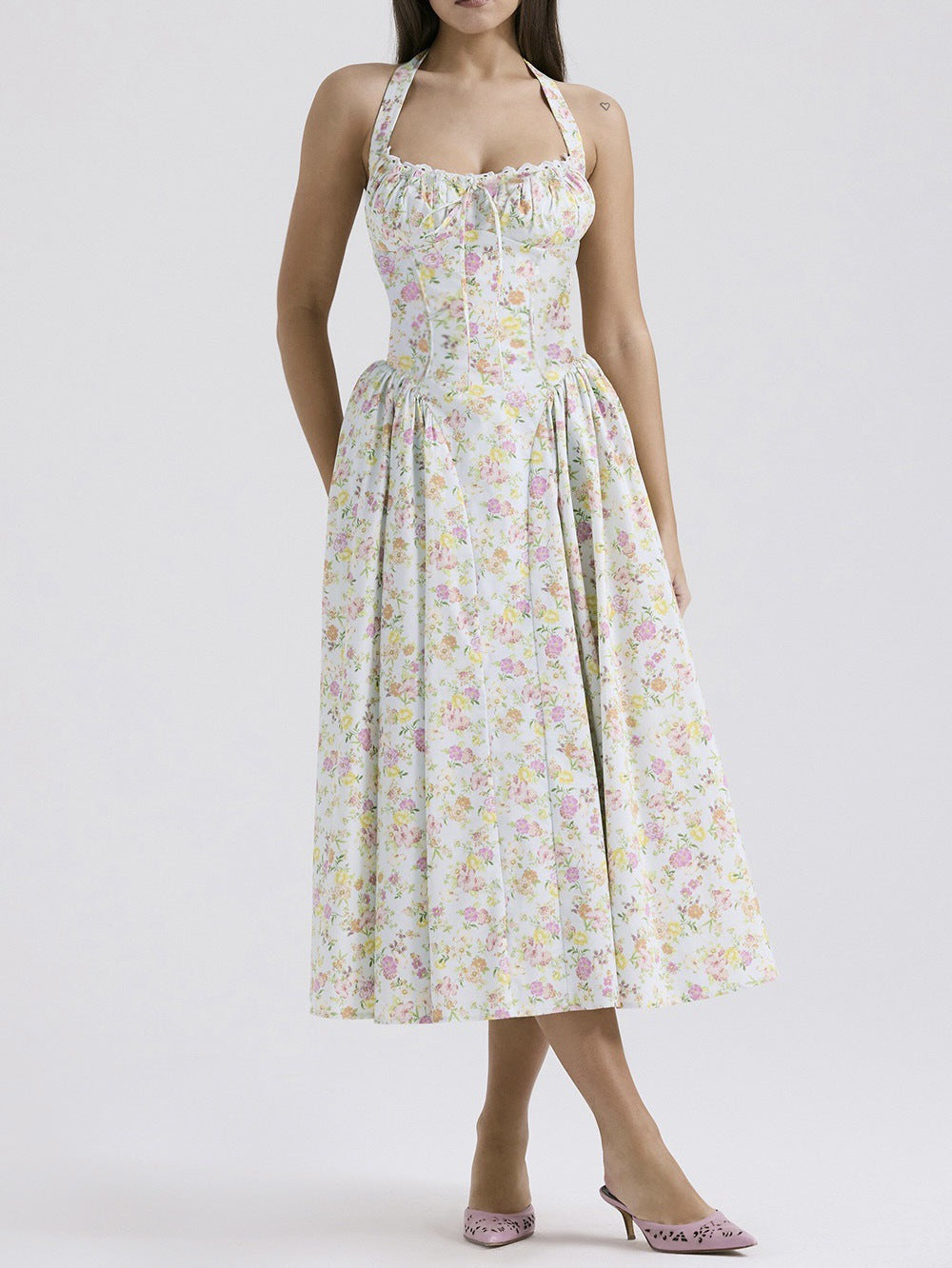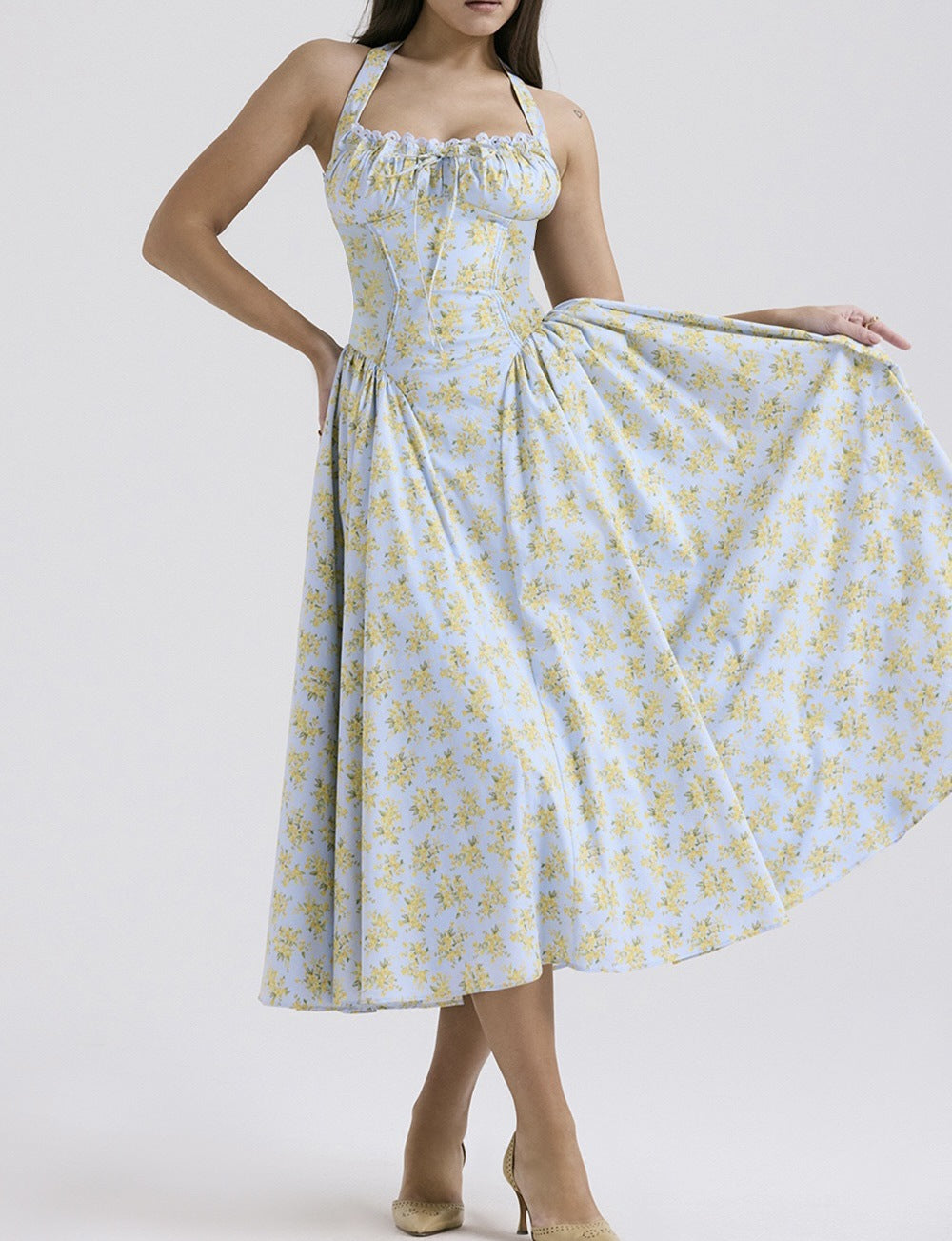 Robe femme à col halter – Coupe ajustée – Dos nu – Jupe midi évasée élégante