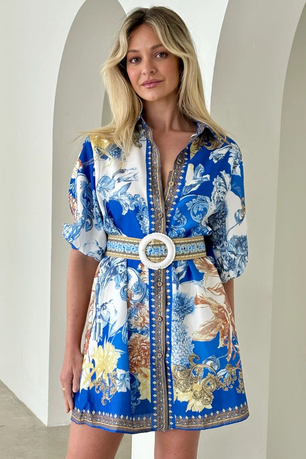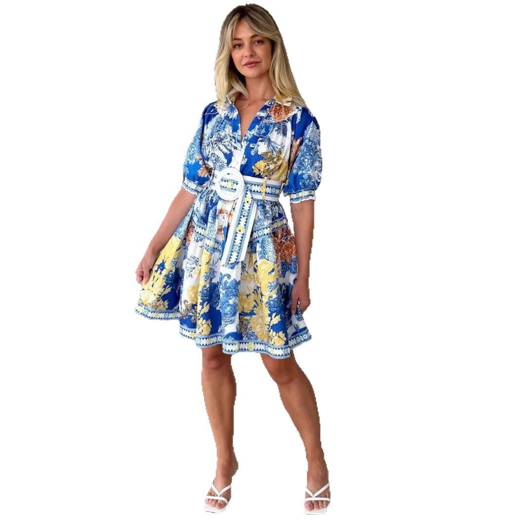 Robe femme évasée – Mélange coton – Manches bouffantes – Col en V – Taille ceinturée