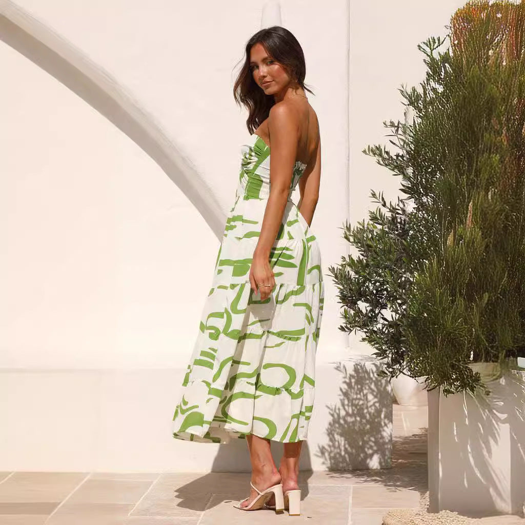 - Design: Coupe évasée avec bustier froncé et dos nu.