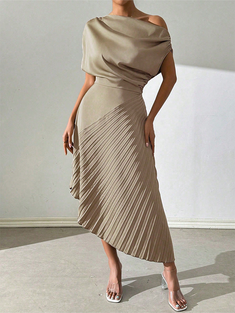Robe midi femme – Asymétrique – Épaule dénudée – Jupe plissée – Taille cintrée