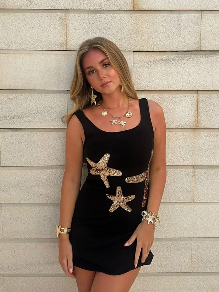Robe mini femme – Coupe moulante – Sans manches – Ourlet ondulé – Détails étoile de mer