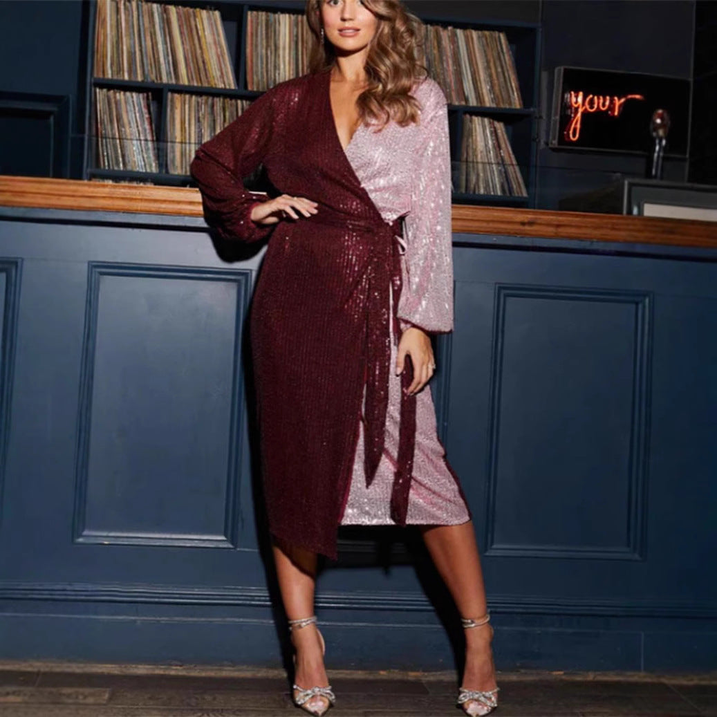 Robe portefeuille femme – Coupe ajustée – Sequins – Manches longues – Longueur midi