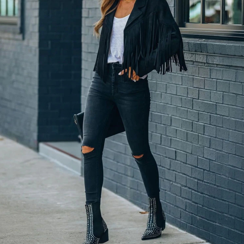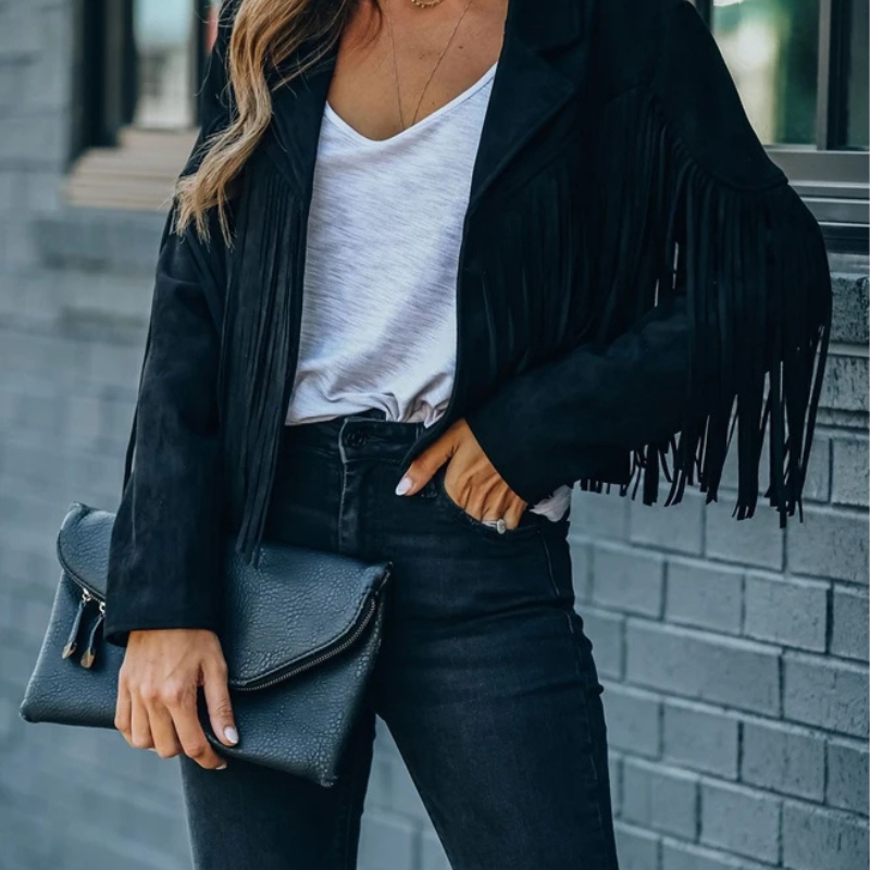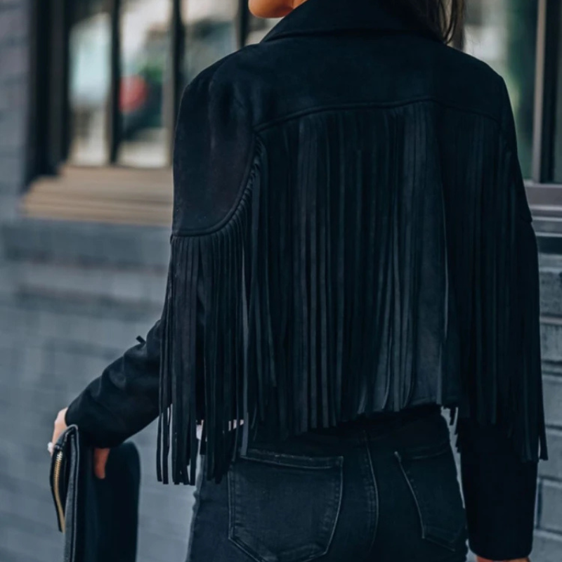 Cette veste en daim apporte une touche western avec ses détails à franges. Conçue pour un style facile à porter, elle se marie parfaitement avec un jean ou une jupe pour un look décontracté et affirmé.