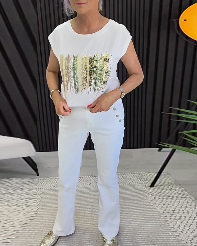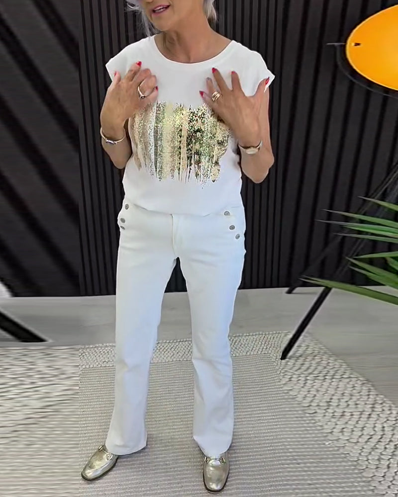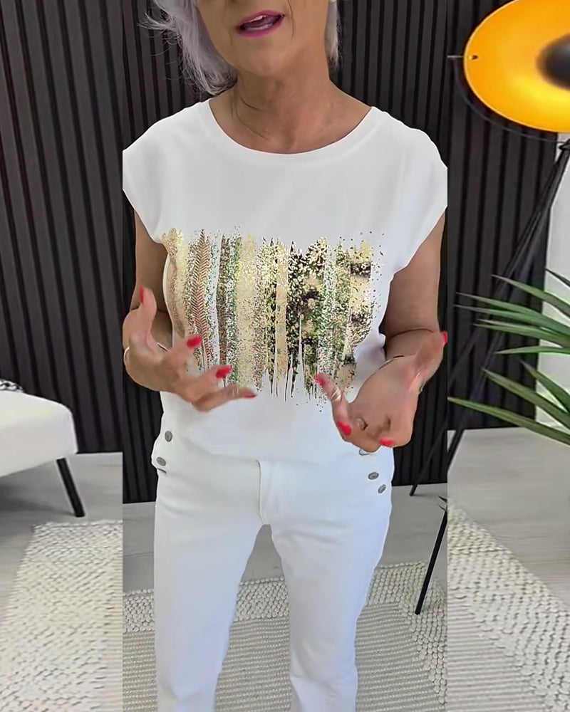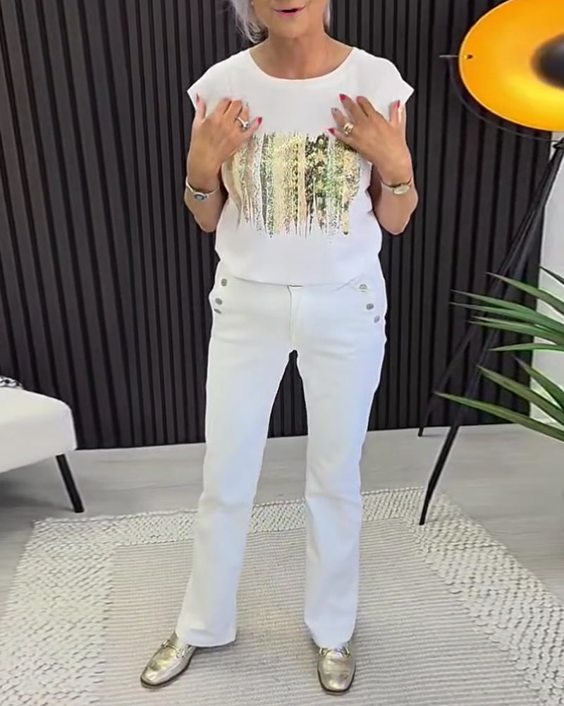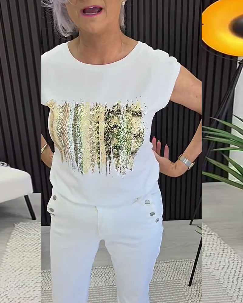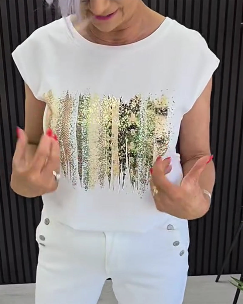 T-Shirt Col Rond Imprimé Manches Courtes Polyvalent