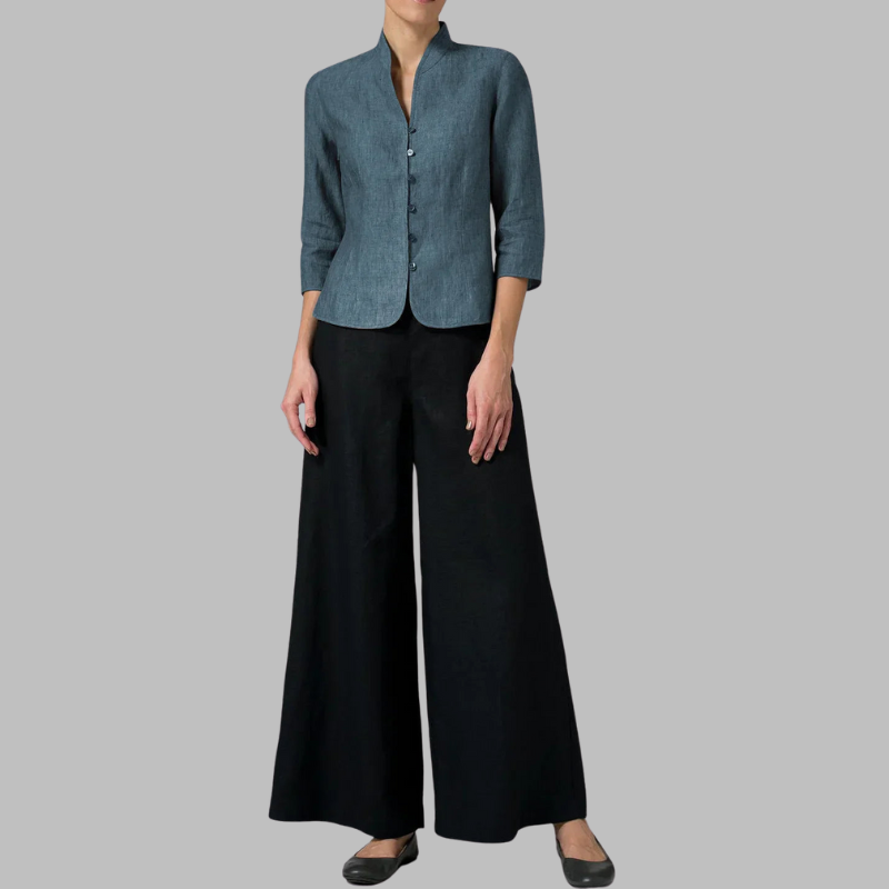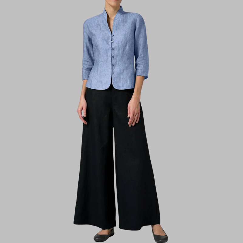 La blouse Tessa en chambray pour femme allie élégance et confort au quotidien. Fabriquée à partir de tissu chambray premium, elle présente un col montant élégant, des manches trois-quarts et une fermeture à boutons sans couture, ce qui en fait la blouse polyvalente parfaite pour des occasions à la fois décontractées et formelles. Que vous soyez au bureau ou lors d'une sortie le week-end, la blouse Tessa sublime votre look en toute simplicité.