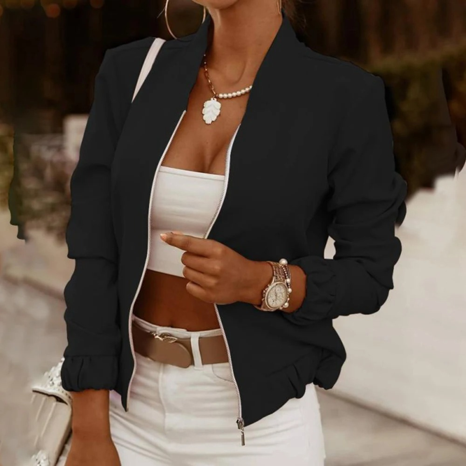 - Design élégant : Coupe cropped et détails modernes qui ajoutent une touche raffinée.